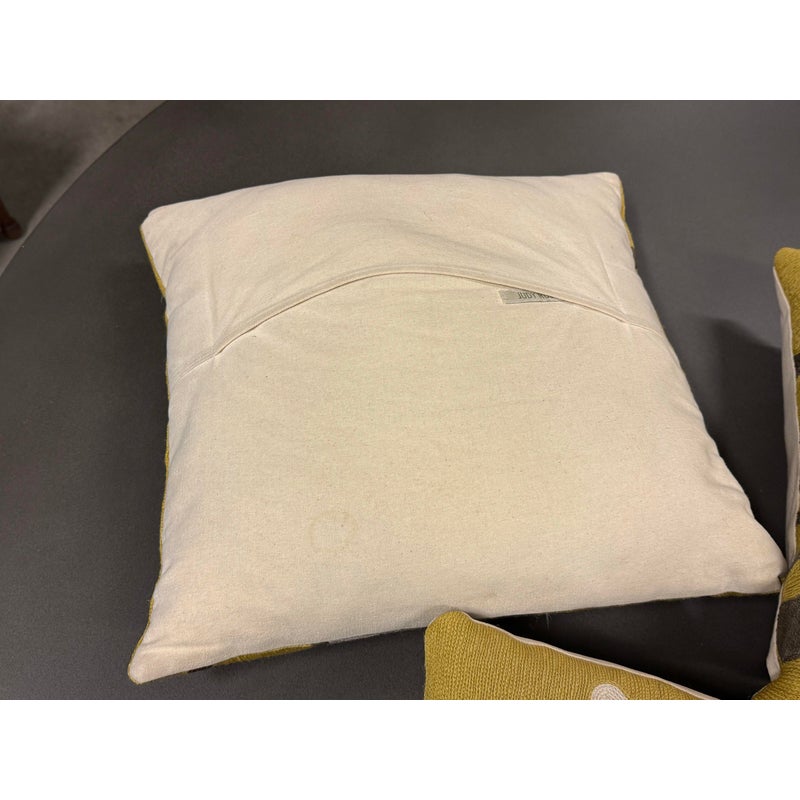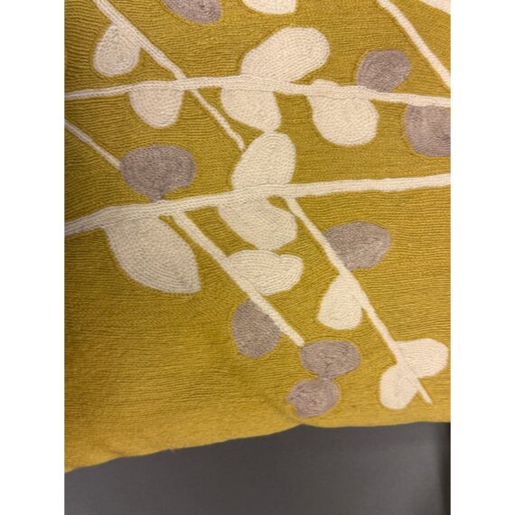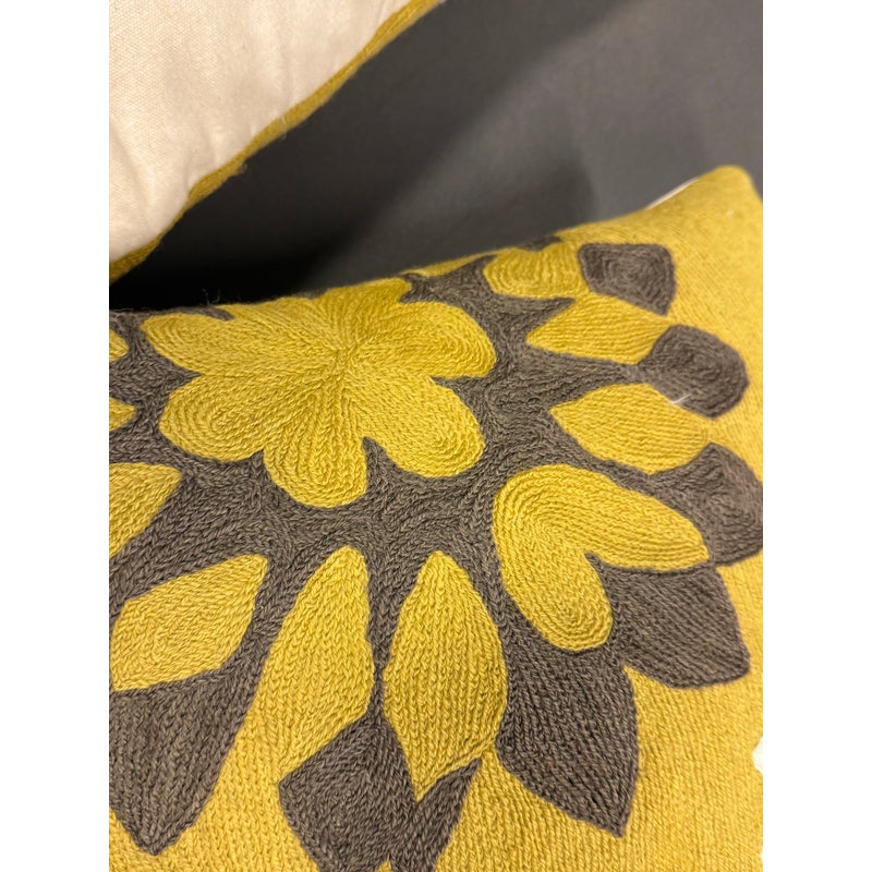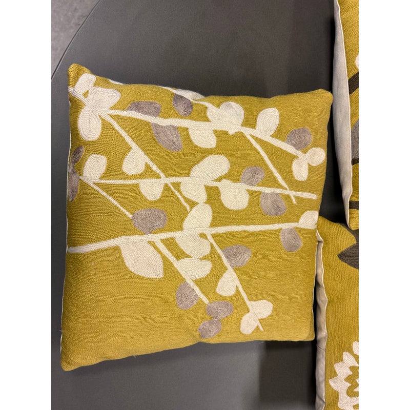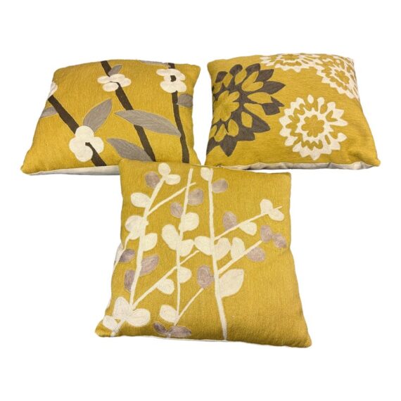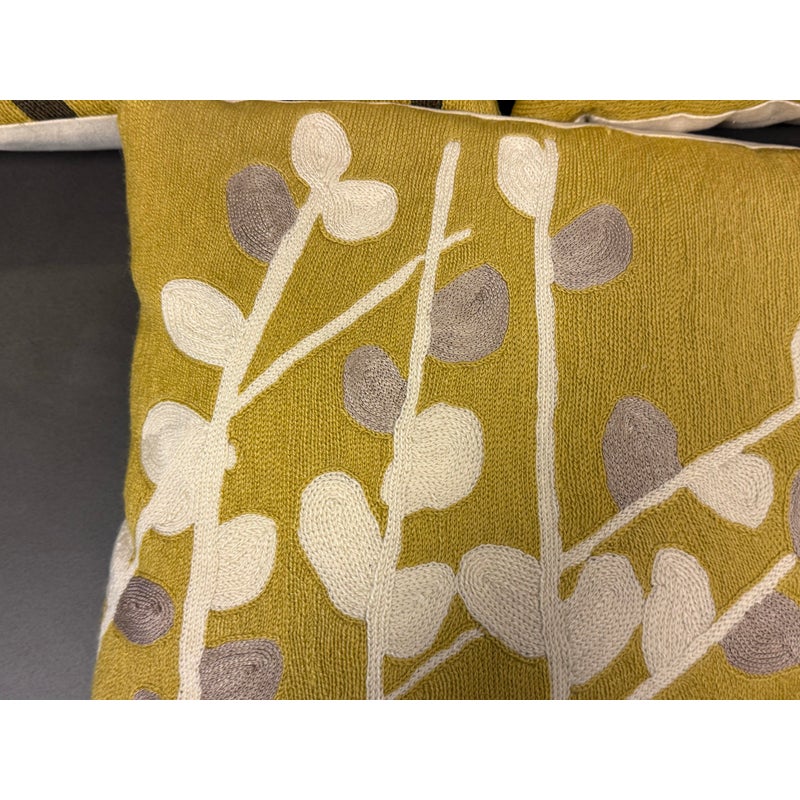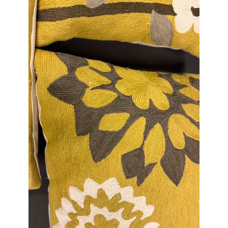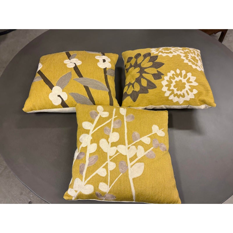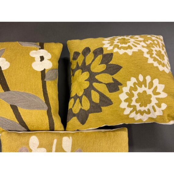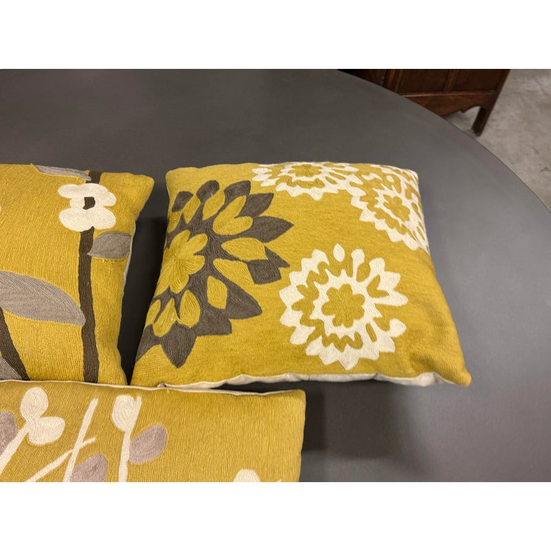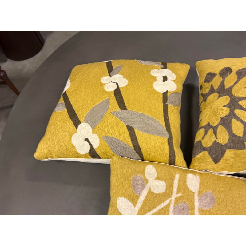 Design Plus Gallery presents a Set of Three Crewel Stitched Embroidered Pillows from Judy Ross. Discover the artisan beauty of this set of three throw pillows by renowned textile designer Judy Ross. Each pillow is a unique celebration of botanical form, rendered with exquisite attention to detail in the rich tradition of Indian crewel embroidery. The set includes three distinct botanic prints. In good condition, visible and minimal wear from usage.