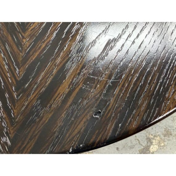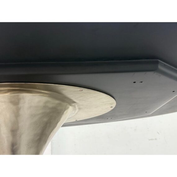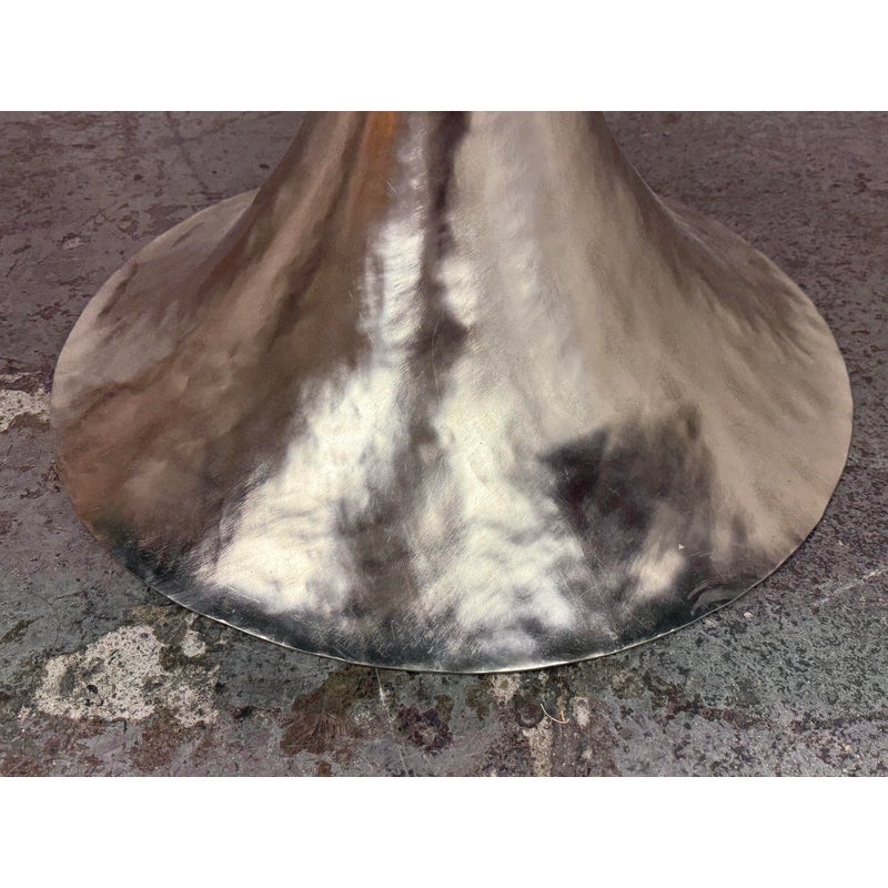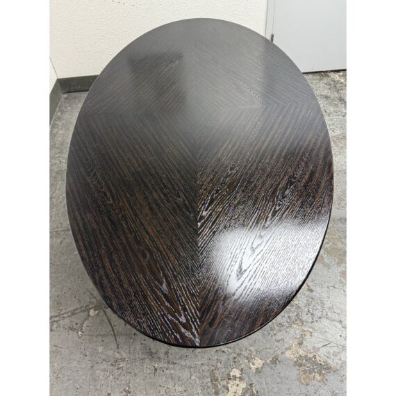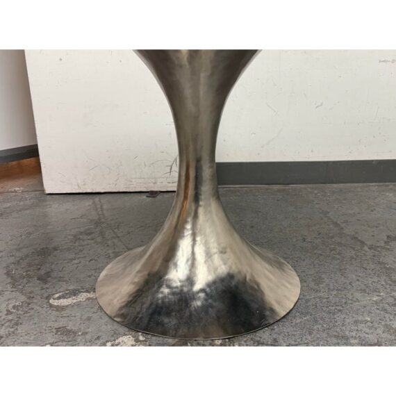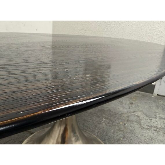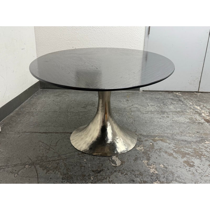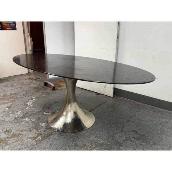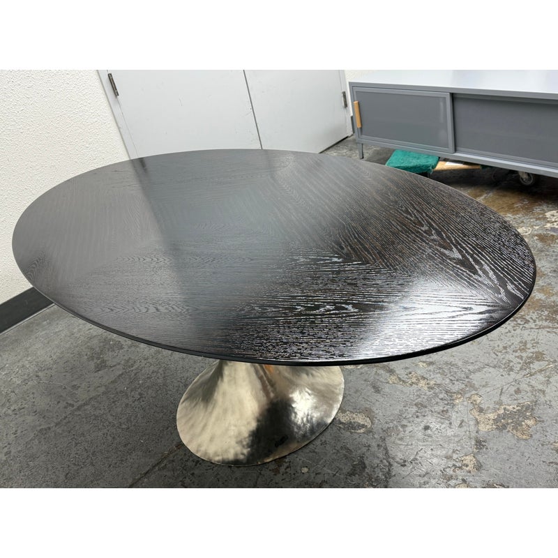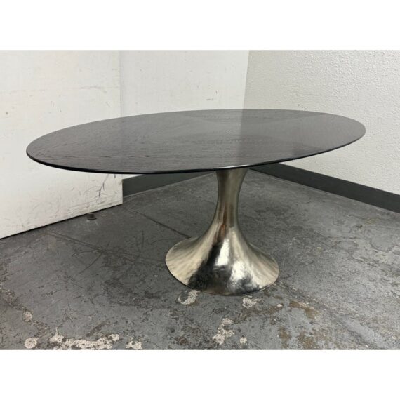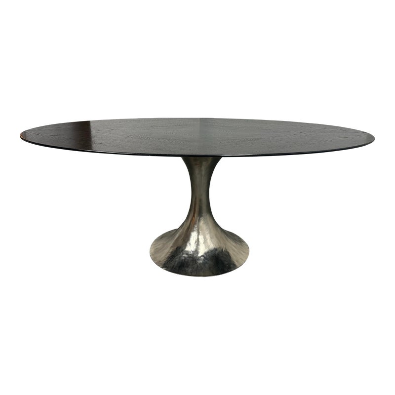 Design Plus Gallery presents the Oval Dakota Dining Table by Julian Chichester. The table is inspired equally by Saarinen and Brancusi and has become a classic. Offered here with an oval oak wood top with dark finish with a their subtle Antiqued Nickel tulip shaped base. Its eglomise is hand applied and is unique in its appearance. Is in good condition for its usage with minimal visible surface wear.