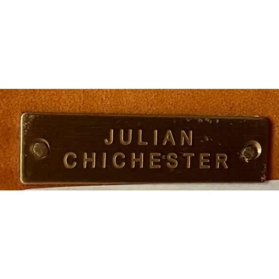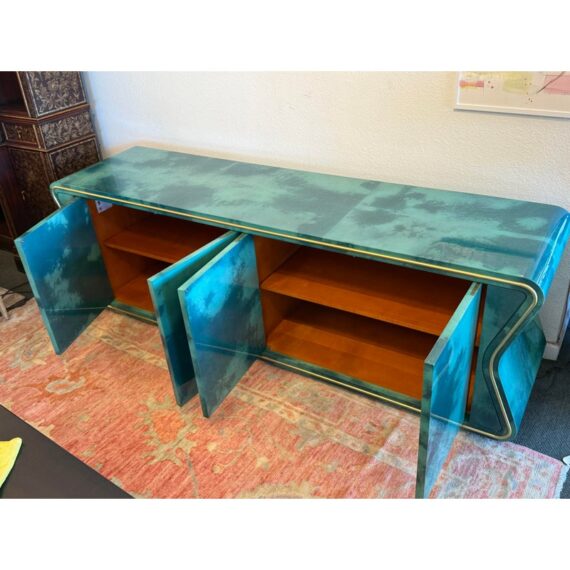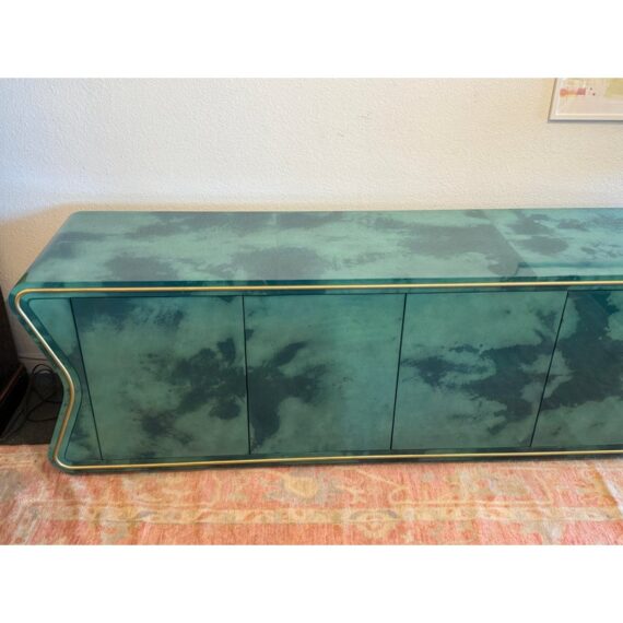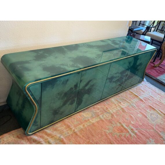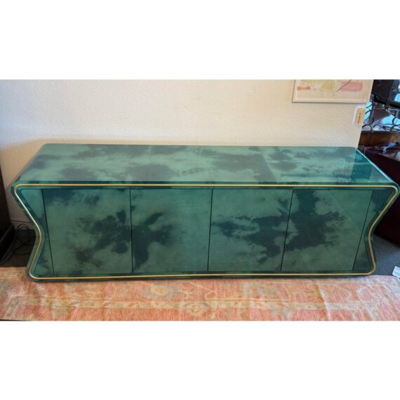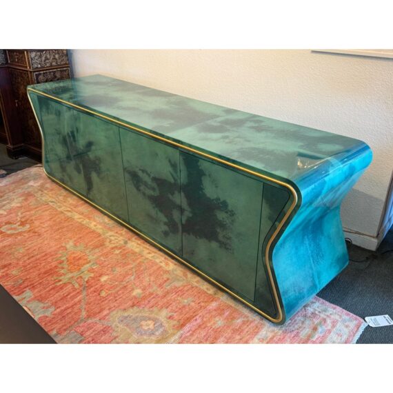 Design Plus Gallery presents the Deneuve Teal Cabinet from Julian Chichester. The stunning storage cabinet has a surprising silhouette with an teal green finish. The vellum wrap is hand applied of natural skin, each unique, while variations in shade + tone is protected with a gloss finish. The shape is detailed with hand hammered brass trim. Push to open doors open to reveal roomy stained interior storage with adjustable solid wood shelves. Elevated slightly on brass trimmed disc shaped feet. Showroom sample condition.