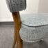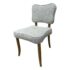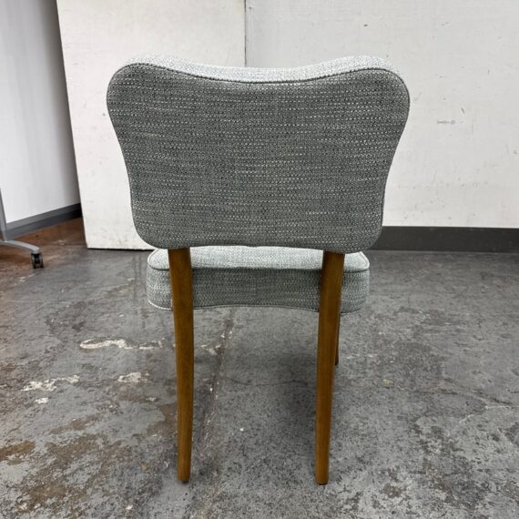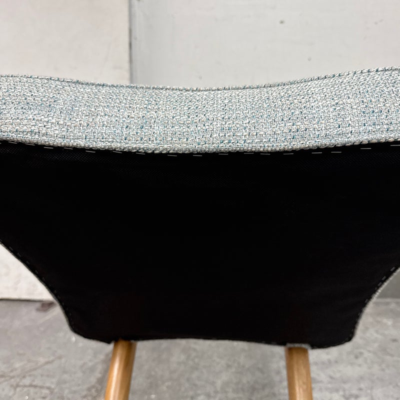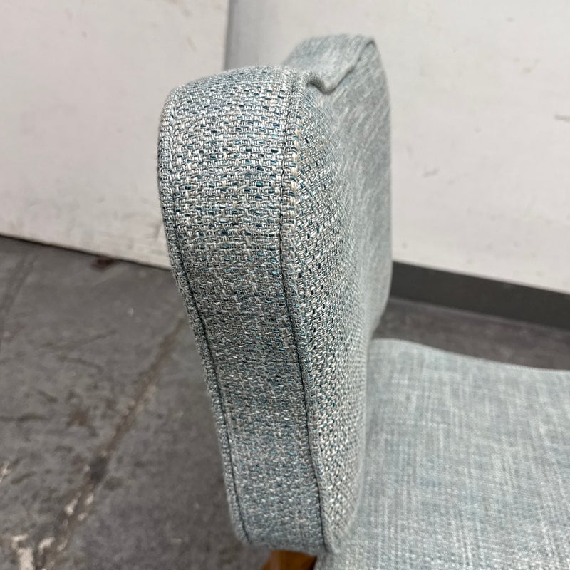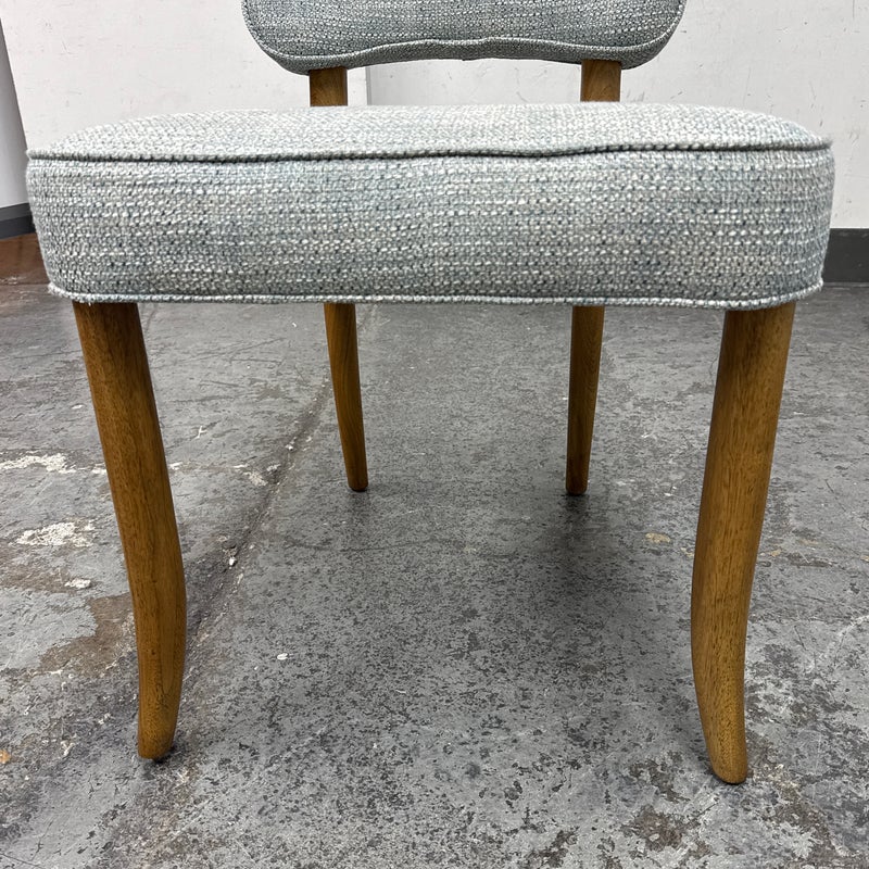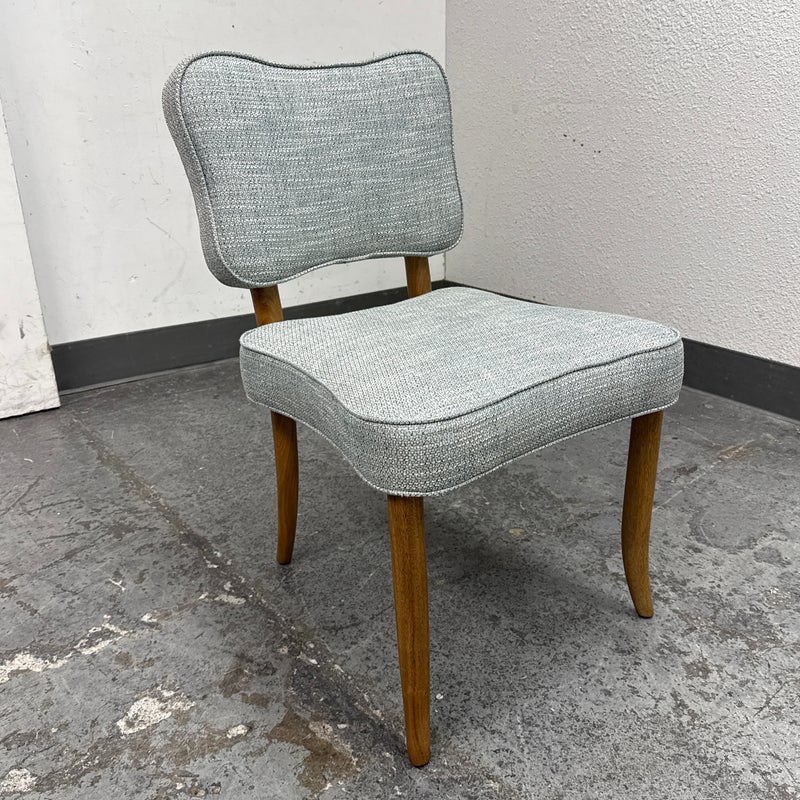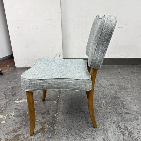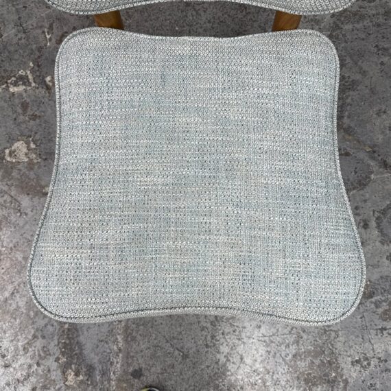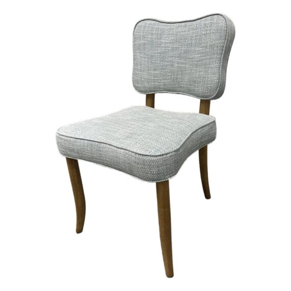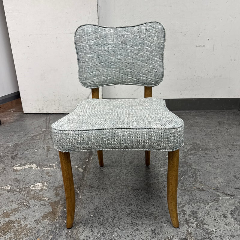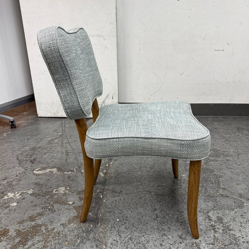 Design Plus Gallery presents a Lille Side Chair by Julian Chichester. The chair draws inspiration from the Mid-century modern era. It features a clover shaped back & seat with curved sabre legs. Is in good showroom like condition. The chair offers a medium brown finish to the wood frame with a woven upholstery of light blue + cream, giving the chair an airy presence. It is in good showroom like condition with minimal visible wear.