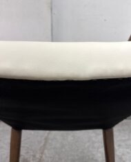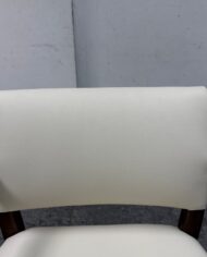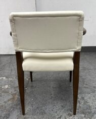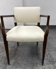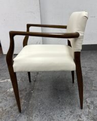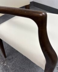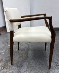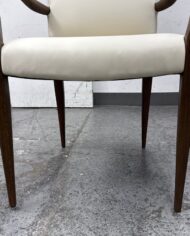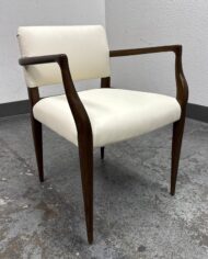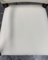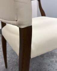 Design Plus Gallery presents a Luccio Arm Chair from Julian Chichester. With its 1950s styling and lightweight elegant frame, the Luccio chair is extremely comfortable. It offers premium materials/textiles to add to its comfort. Creamy white leather is found enwrapped around the entirety of the seat with exposed arms and legs from the frame in solid oak wood. The beautifully sculpted solid oak frame is inspired by a 20th century original, but the scale of the Luccio Side Chair is entirely fresh for today. Is in good showroom like condition for its usage. Made in the USA.