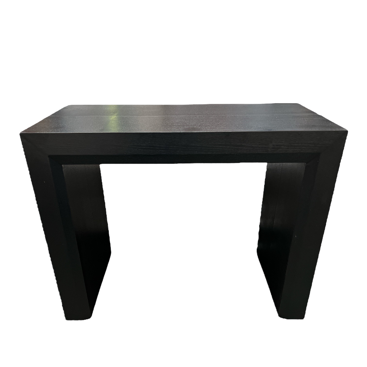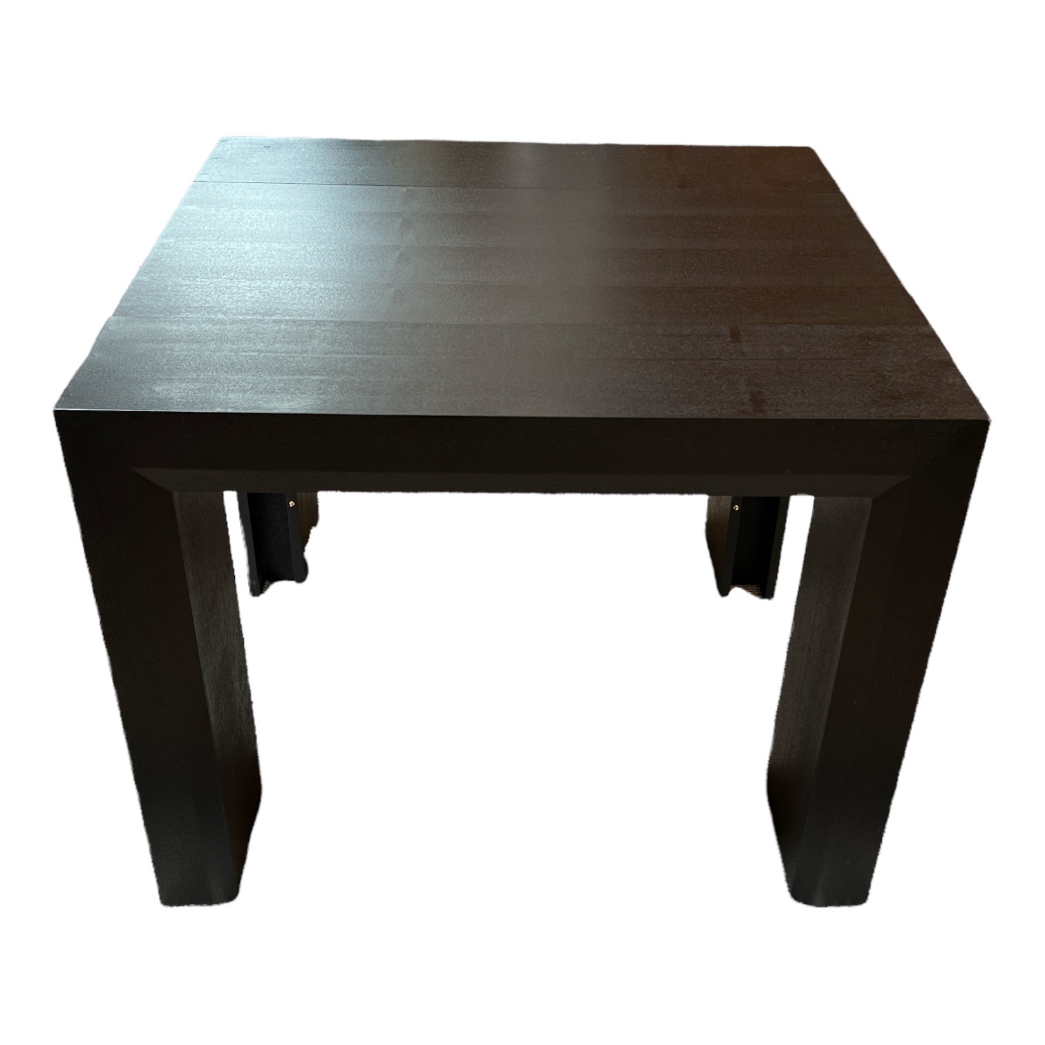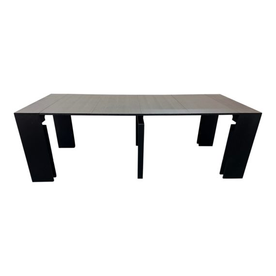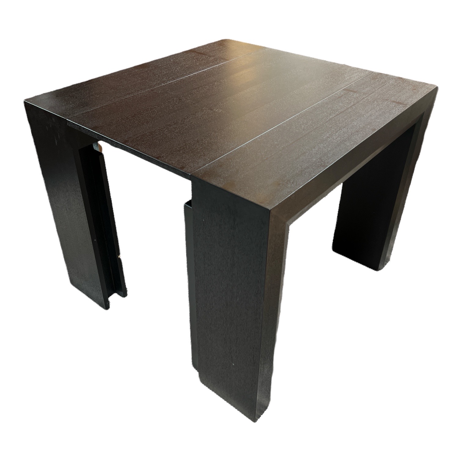 Design Plus Gallery presents a Junior Giant Edge Modern Extension Dining Table + 4 Leaves. When completely compacted, the table is sleek and can serve as a console. It has deep bevels on the apron and legs’ inner edges. When fully extended, the table can seat between eight to ten people. The extensions feature magnets, and a central rotation support bar. Minor wear from use; table is in good condition.