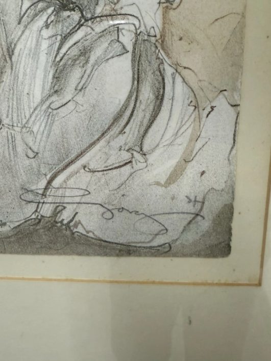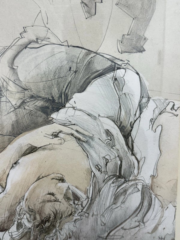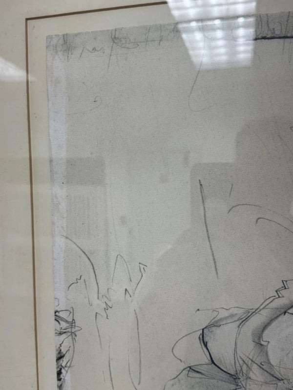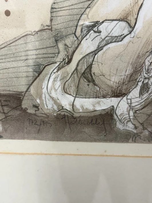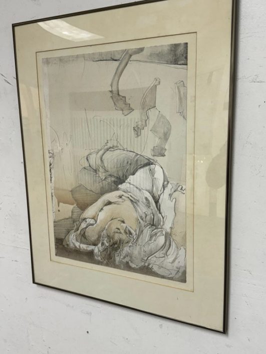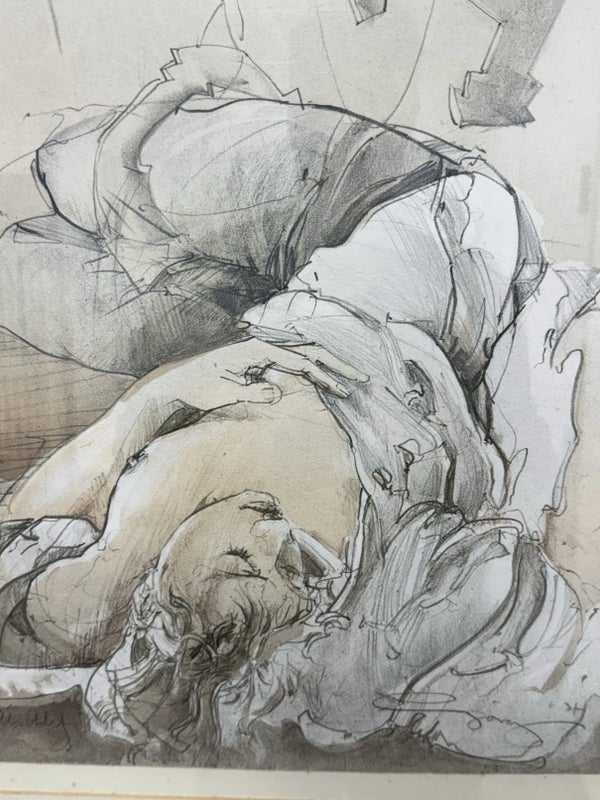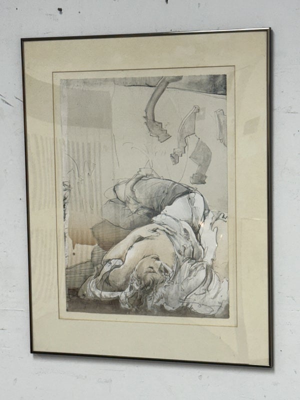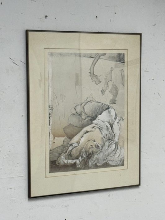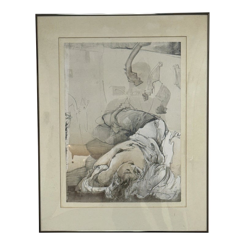 Design Plus Gallery presents “Halbschlaf” a Signed Etching by Jürgen Görg. Born in 1951 in Dernbach, West Germany, Jurgen Gorg has established himself as a master craftsman and consummate artist. Gorg etchings and lithographs reflect his innate talent and imagination. His subject matter consists of lovers, dancers, musicians and masked personages. Tender, lithe, slim, and young, these idealized, incompletely rendered figures suggest the timeless and eternal. The focus centers on body language and kinetic movement. By leaving the faces vague, with eyes almost always closed, there is room for dreaming, both in the viewer and within the subjects of the painting. The drawing is in good condition with minimal signs of wear