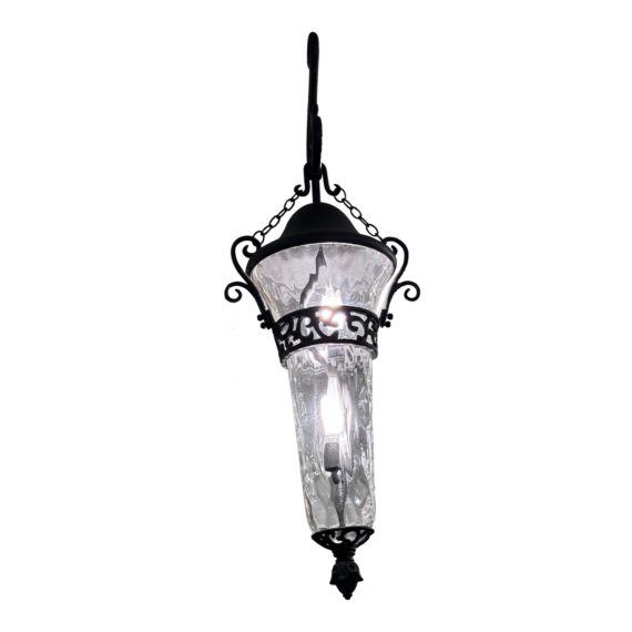 Design Plus Gallery presents the Anastasia Hanging Pendant by Kalco. This beautiful hanging pendant has the ability to be indoor and outdoor, lending itself to limitless possibilities The light fixture has a long glass cyclone that tapers from wide at top to more narrow at the base. Has a matte black metal work wrapping around the glass, at the base, and where the mount is offers incredibly detailed cast work. The pendant is in good condition, with minimal wear.