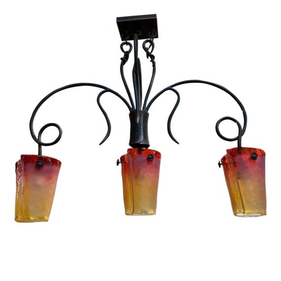 Design Plus Gallery presents the Metal + Glass 3-Light Chandelier by Kalco. The body is constructed with metal and features elegant spirals and curves. Takes three lightbulbs. Each light has a rolled glass shade, slightly conic, with a color variation from red to yellow. Minor wear from use; chandelier is in good condition.