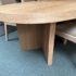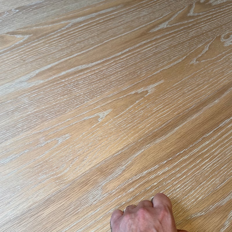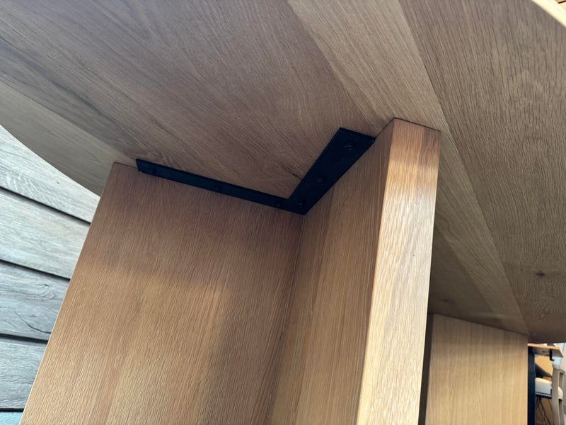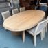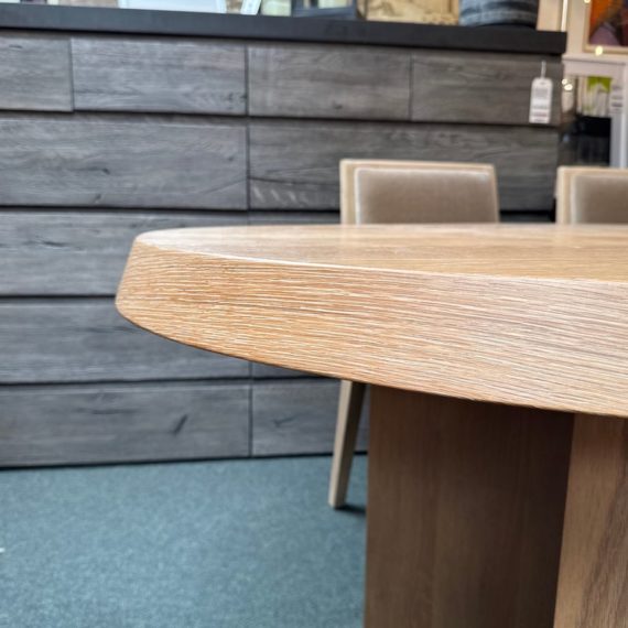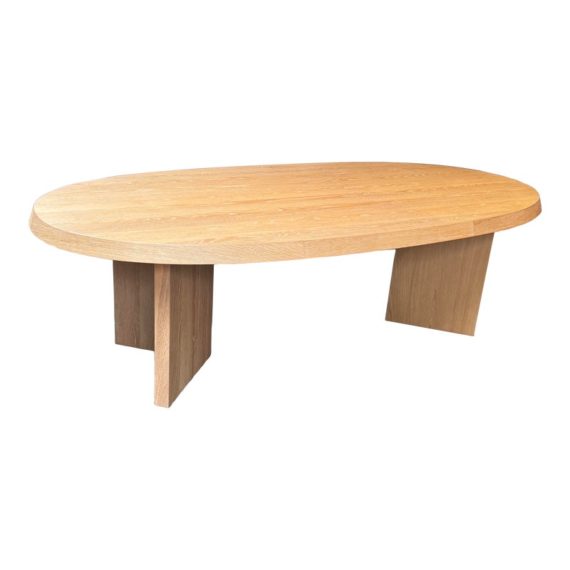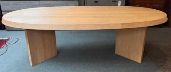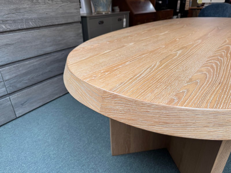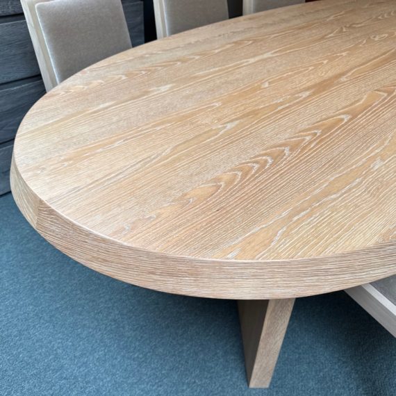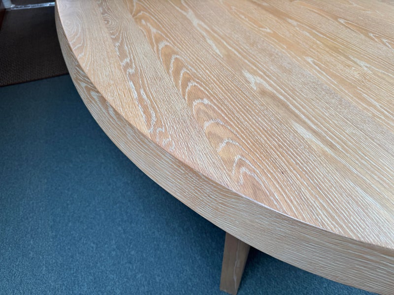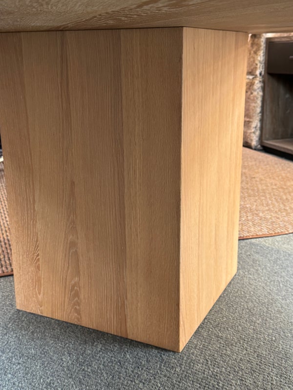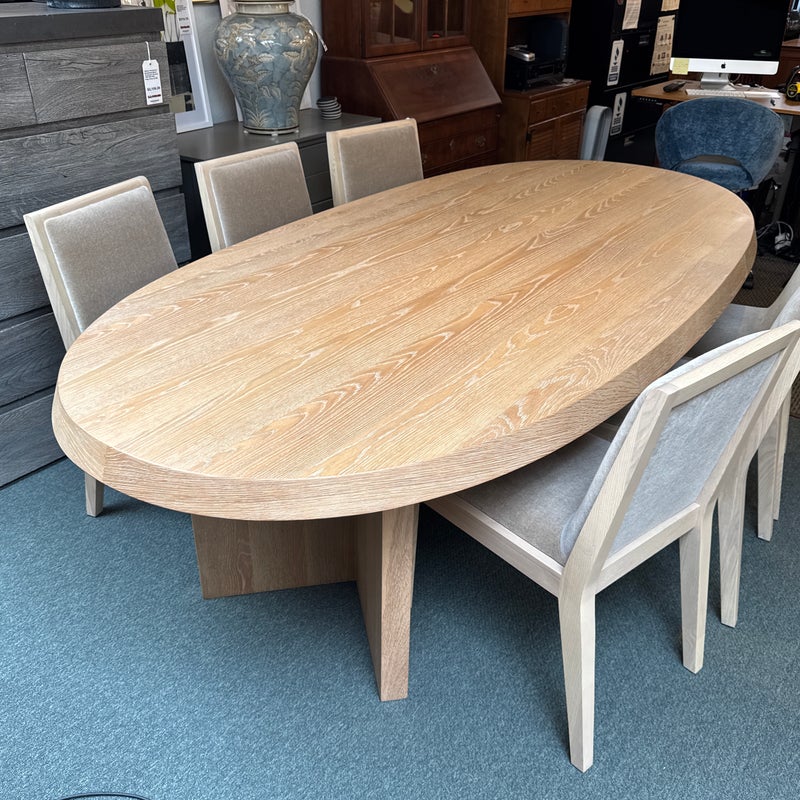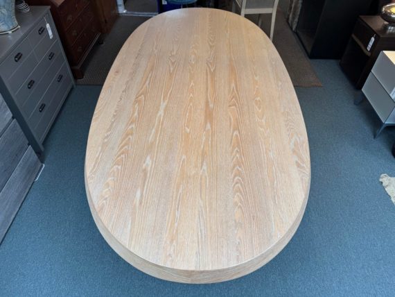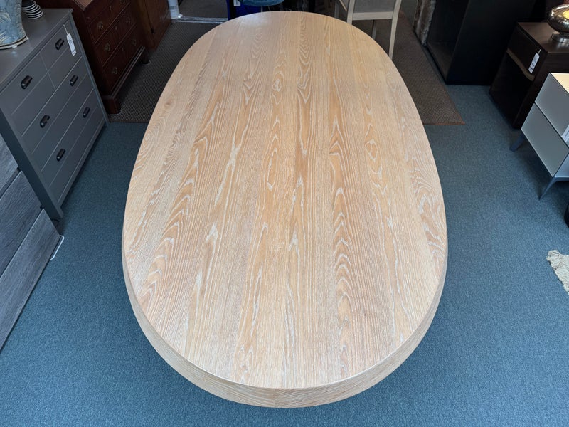 Design Plus Gallery presents the Ellipse Dining Table by McGuire Furniture. Designed by Kara Mann, the stunning oak veneers and solid wood have a wonderful contemporary flair in silhouette, canted edge and double pedestal. The sandblasted Morel finish keeps the look light and contemporary. Light surface wear; condition is good.