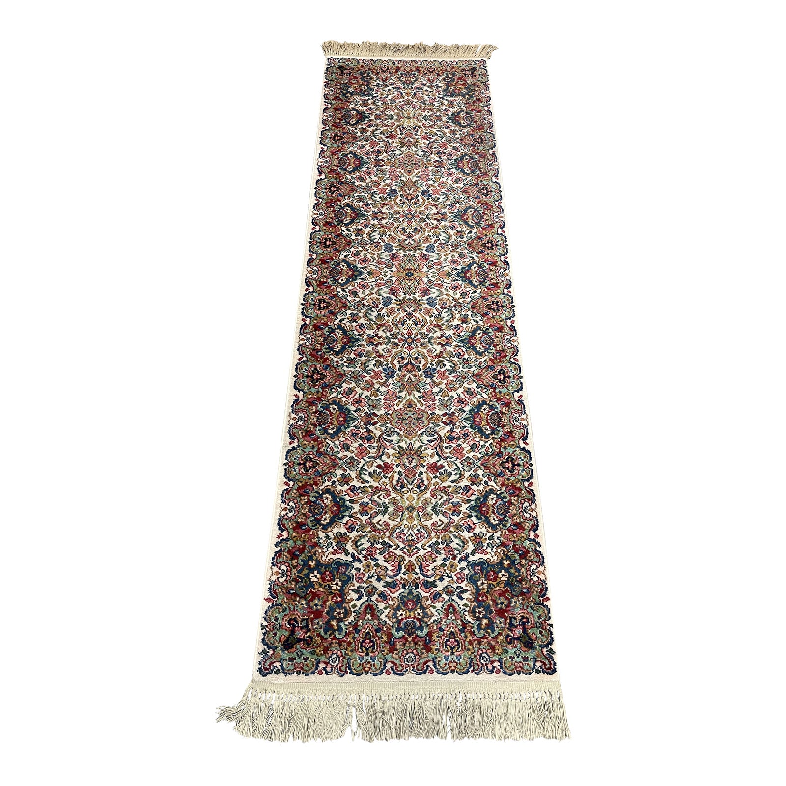 Design Plus Gallery presents a Karastan ” Floral Kirman” Floral Wool Runner. Machine made in U.S.A. with 100% worsted wool fibers. Intricately dense floral patterns radiate from the center in jewel tones on a cream field. Ends are fringed with the cotton backing. Little evidence of wear, good condition.