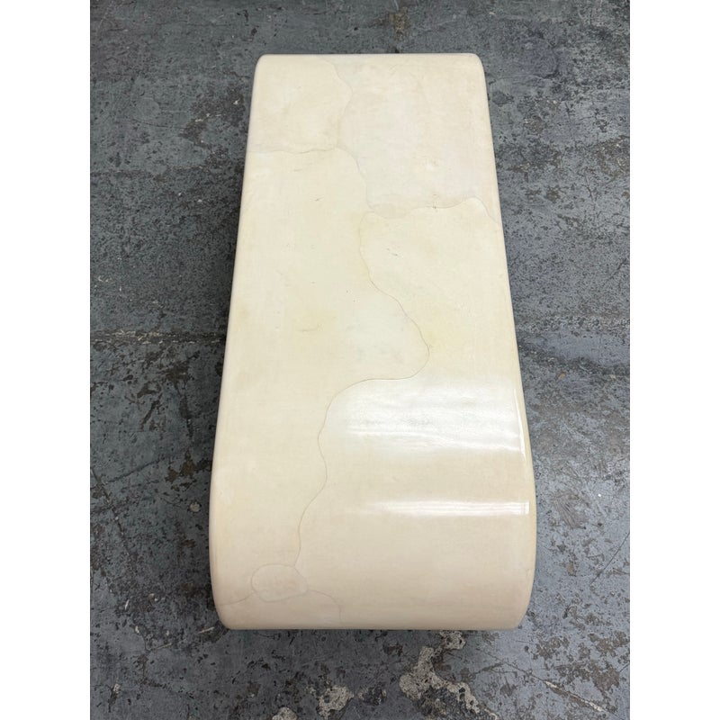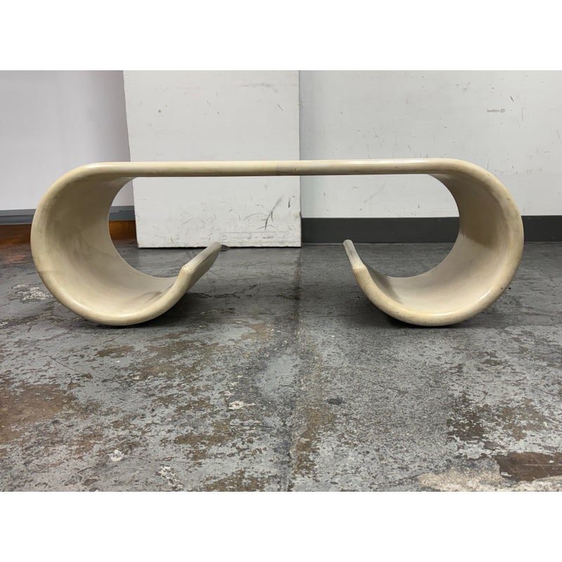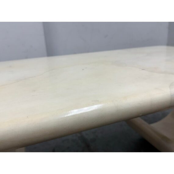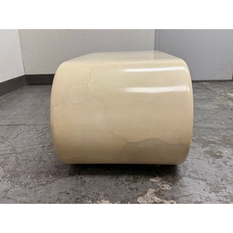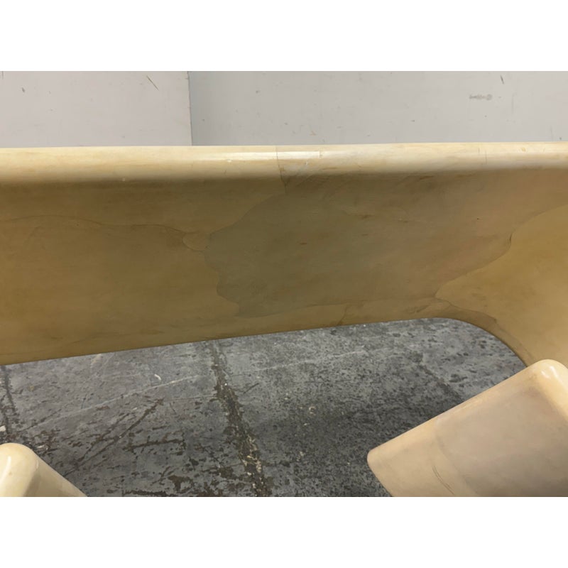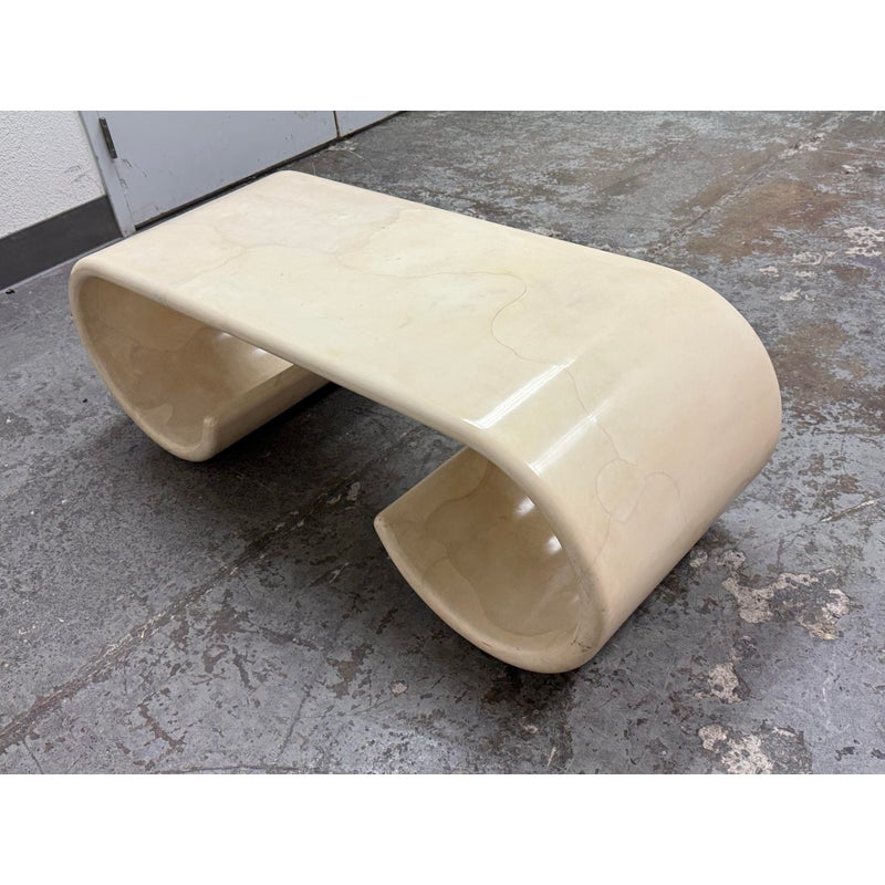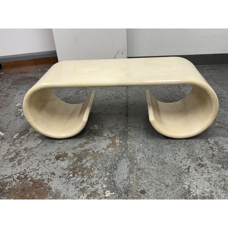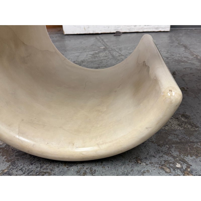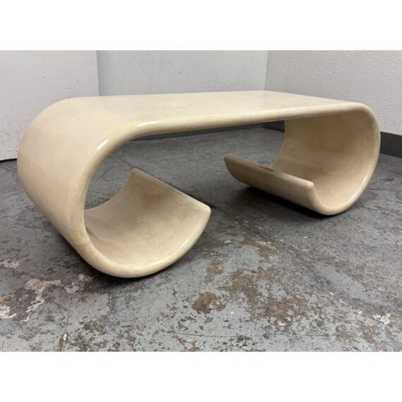 Design Plus Gallery presents the Scroll Coffee Table by Karl Springer from Coup d’Etat. The table is characterized by an elegant, curvaceous, or “scroll” form that gives it a distinct sculptural quality, often featuring rounded edges. The design is reflective of the confident, high-style aesthetic popular in the 1970s and 1980s. The material used is considered a goat skin that is lacquered to the foundation and gives a creamy overall tone. No matter what style you desire for your home, this coffee table will fit right in. It shows visible wear and is considered to be in fair condition for its usage.
