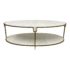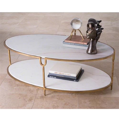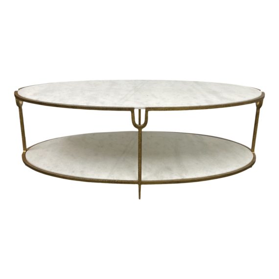 Design Plus Gallery presents a Katherine Hollywood Regency Ivory Stone Oval Coffee Table by Kathy Kuo Home. A sublime centerpiece for the luxurious lounge. The frame is Iron hammered with distress marks. The finish is an Antique brass finish on iron. Light ivory honed white grey marble stone top and bottom shelf.