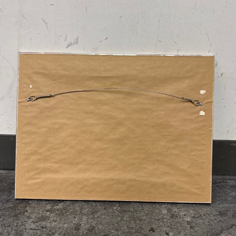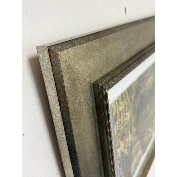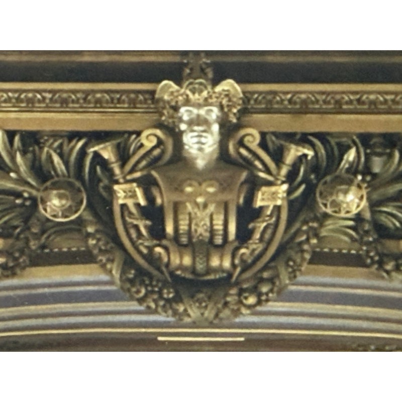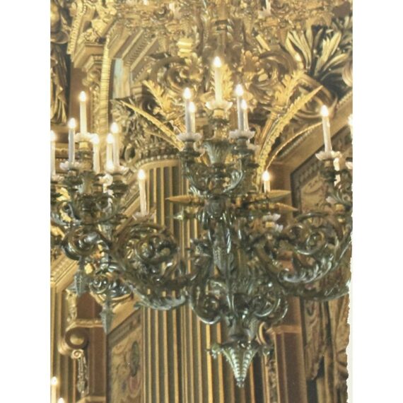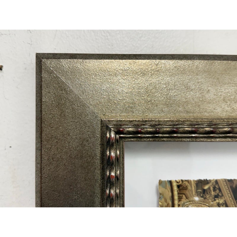 Design Plus Gallery presents a Framed Photography Print of the Opera House in Paris by Kathy Fomal. The view is exceptional of the opulent chandelier room showing you the heavily gilded room of golden accents replete with tapestries, historical paintings and multiple tiered deep hanging chandeliers. It is encased in a burnished silver frame that is thick and also has a white matte to border the photograph print. It is in good condition with minimal wear for its usage.
