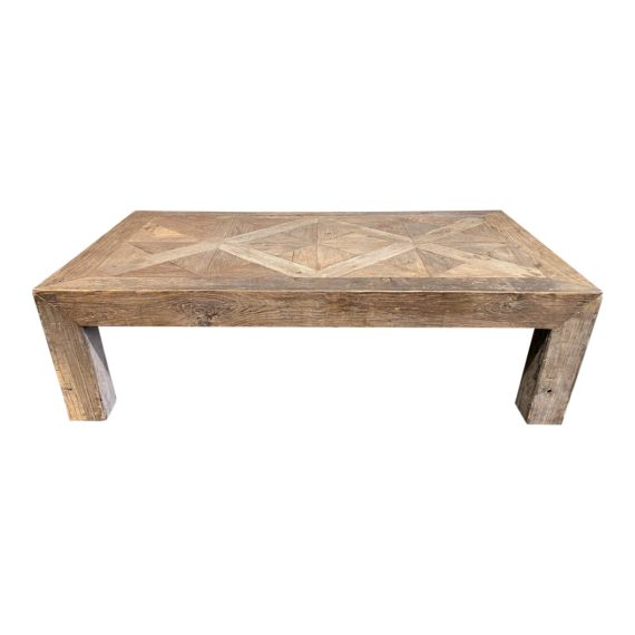 A casual elegant coffee table, gorgeous enough to be a focal point of the room. Sturdy enough to put your feet upon after you’ve kicked off your shoes for the night. Unfinished elm, assembled in a parquet design, boasts beautiful wood grain and unique variations in each piece. Marked “Recycled Wood”