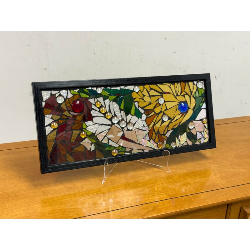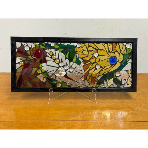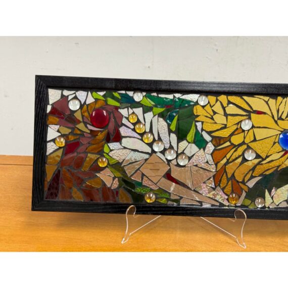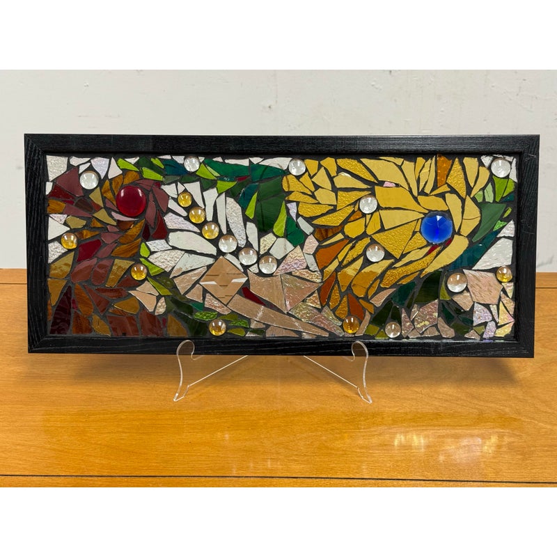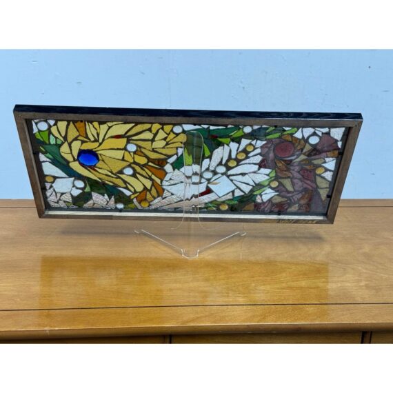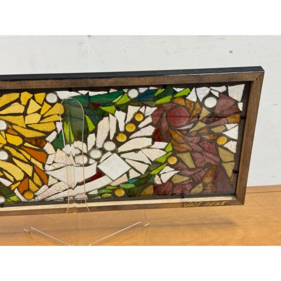 Design Plus Gallery presents a Stained Mosaic Glass by Artist Katie Wolf. A striking fusion of artistry and craftsmanship. The panel showcases a dynamic interplay of organic forms, squares, and circles. Each hand-cut glass piece is thoughtfully arranged, creating a vibrant tapestry of color and light. Rich shades of green, yellow, red, and blue are complemented by transparent accents, allowing light to dance and cast colorful reflections through the panel. The composition’s variety of shapes and tones imbues it with a sense of movement and harmony, while the bold black frame provides a contemporary edge, making it a stunning focal point in any space. In good condition, visible and minimal wear. Made in the USA.