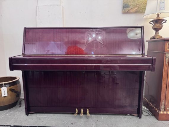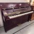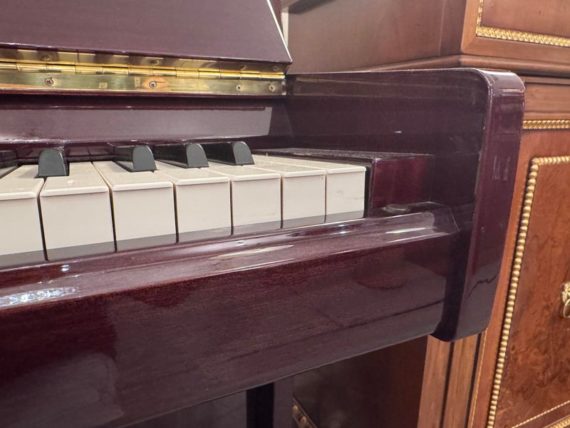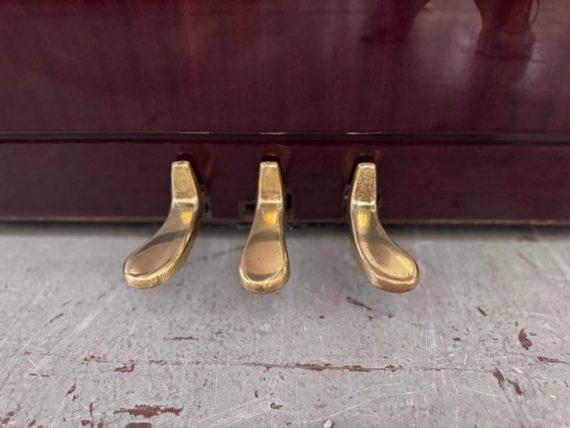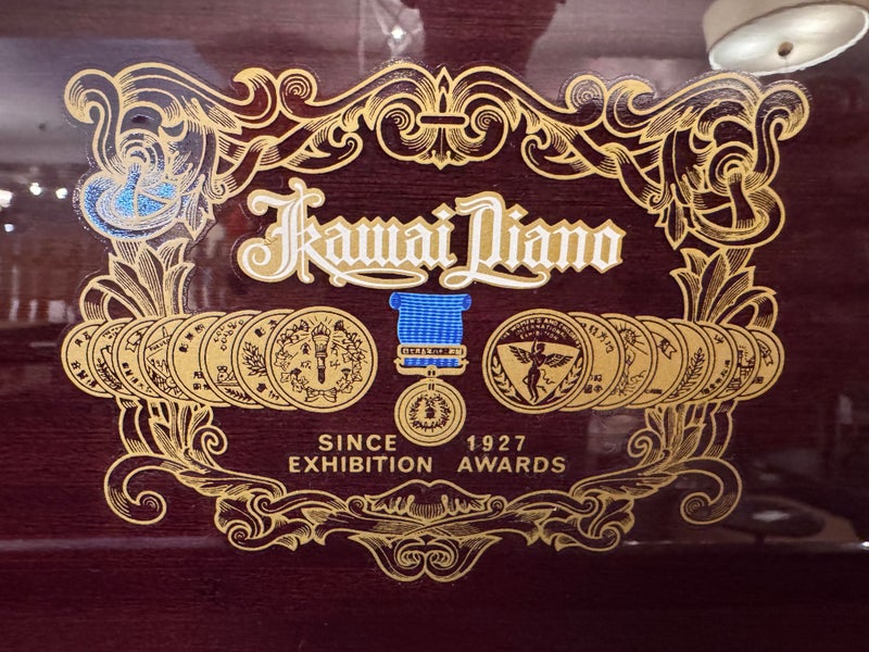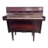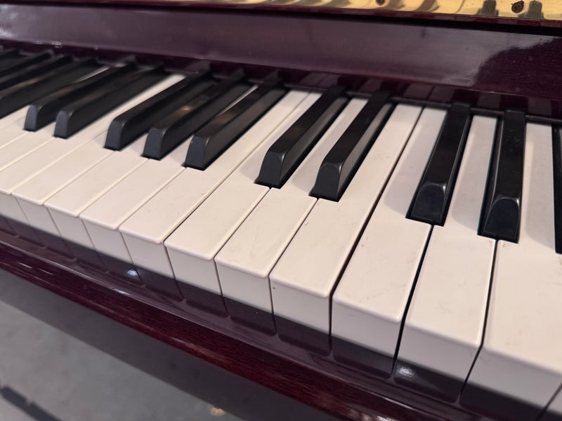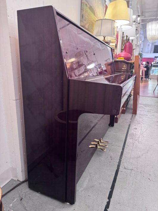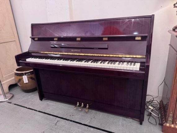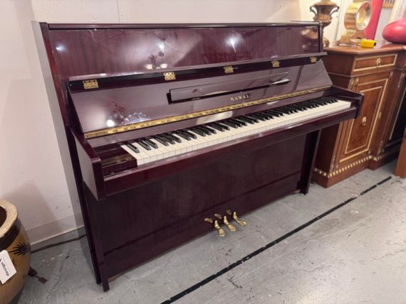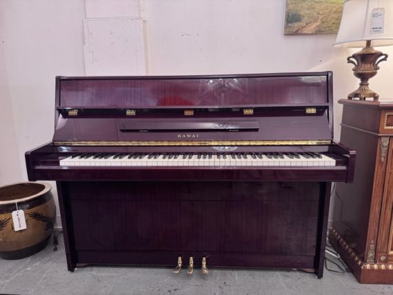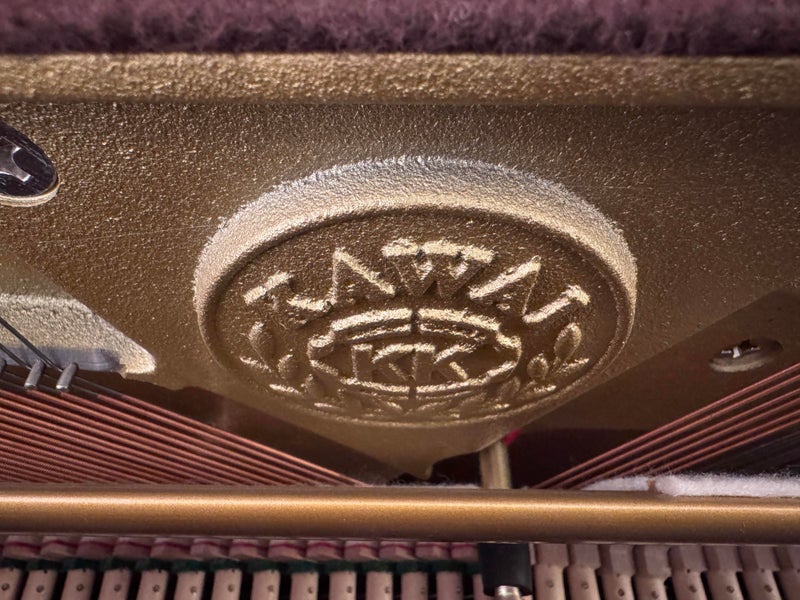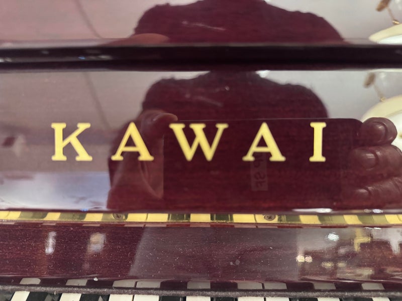 Design Plus Gallery presents the K-15 Upright Continental Piano from Kawai. A cardinal in smaller scale piano’s this upright will allow for excellent instruction for a budding pianist or for an accomplished musician seeking a space saving alternative. The soundboard is made of solid spruce with their highly regarded Ultra-Responsive Direct Blow Action with ABS Styran part. You will hear a rich, clear tone with performance qualities that rival a much larger upright piano. Comes with well proportioned bench. The finesse on its appearance is also of high quality; a richly lacquered and polished mahogany with brass pedals and hardware, written with gold gilt. Extraordinary find at Design Plus Gallery. Primarily in good condition with surface wear on the frame and needs tuning, also visible wear to the bench seat.