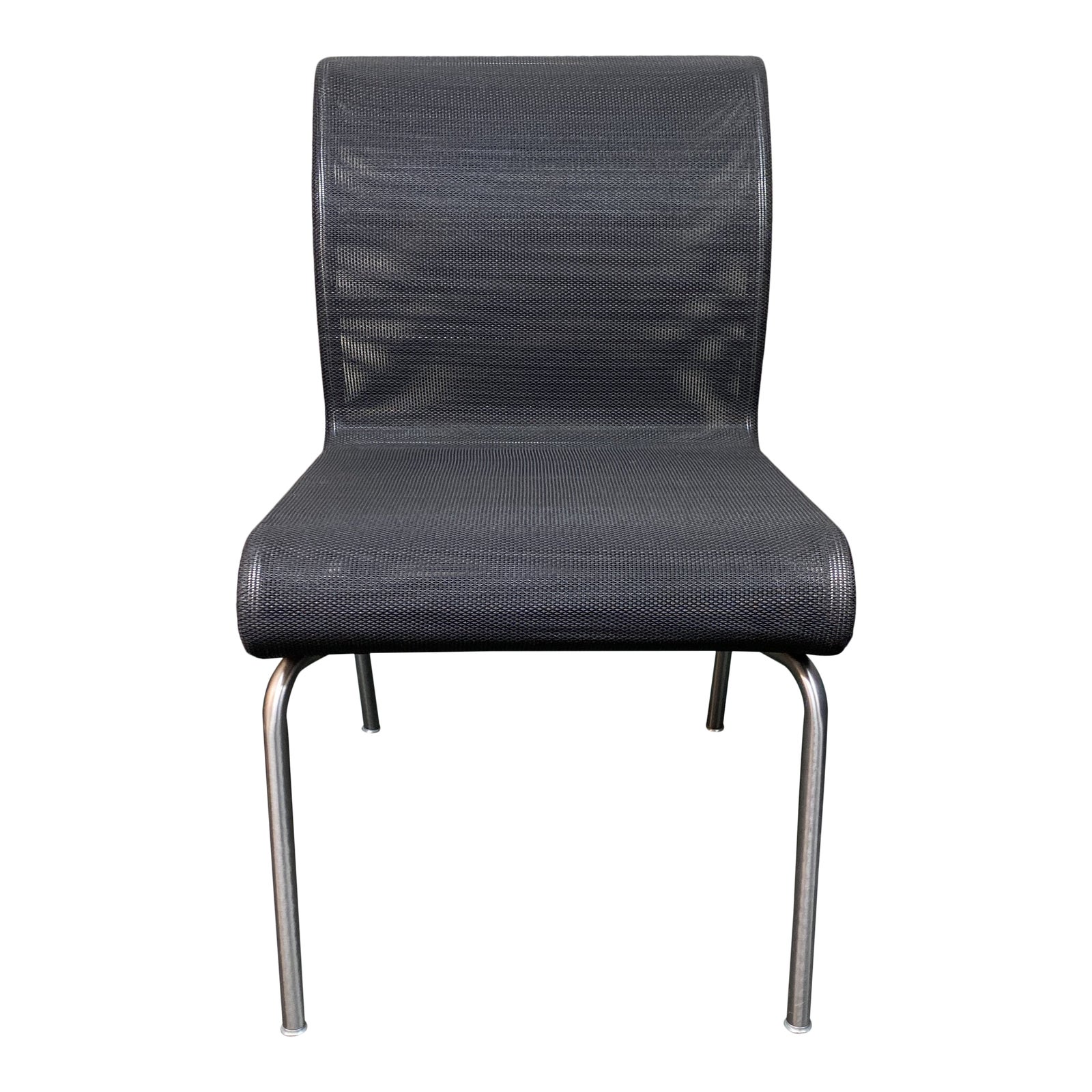 Design Plus Gallery presents a Keilhauer Net Side Chairside Chair. Oiled steel metal is cantilevered in a elegantly modern and light weight sculptural formation. A ventilated black mesh fabric forms the seat and back rest. Minor wear on surfaces. Back rest has a slight rocking motion due to the engineering and design. Keilhauer is a contract based furniture company out of Toronto. Internationally recognized for award-winning design and extreme craftsmanship.