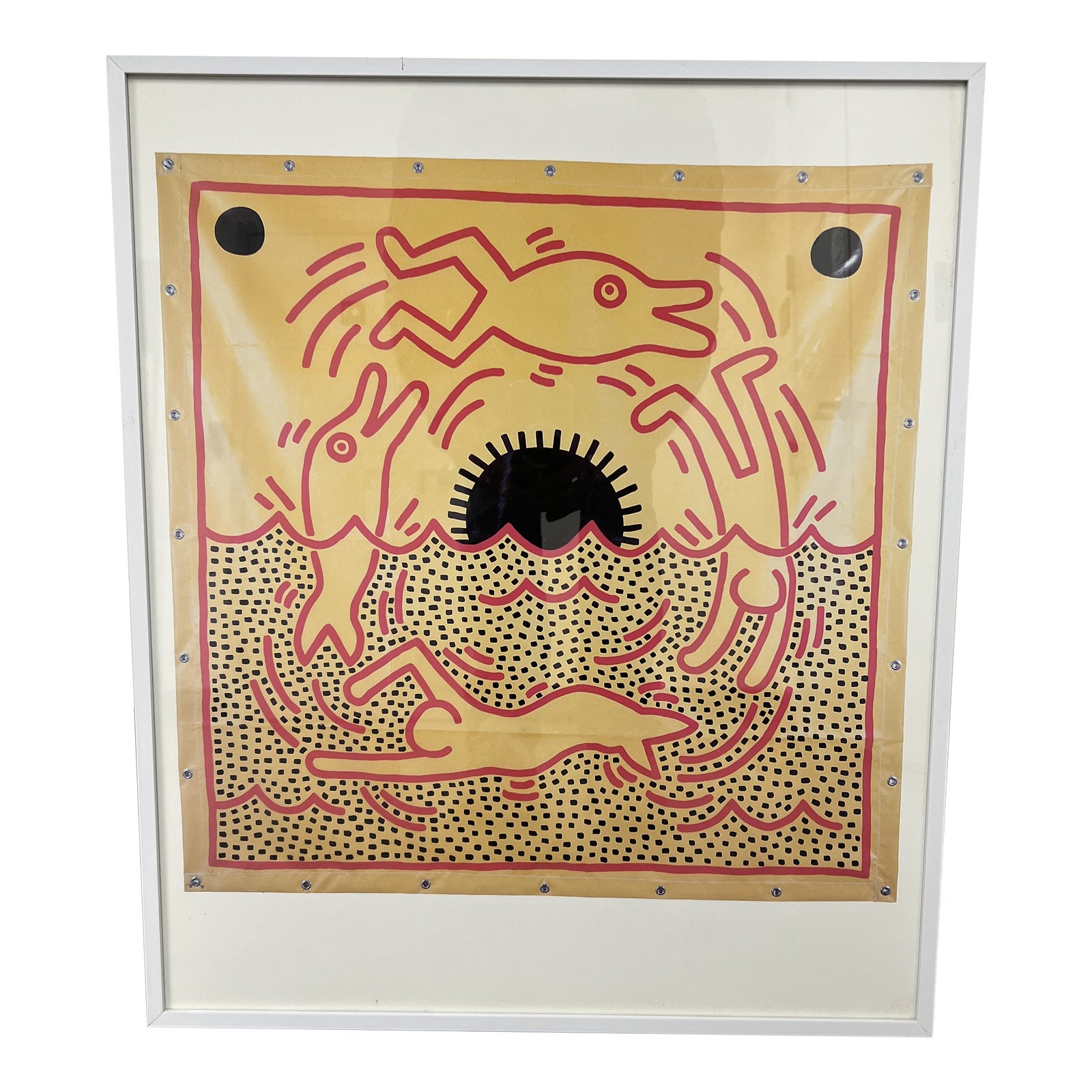 Design Plus Gallery presents a Keith Haring Custom Framed Poster “Man Swimming + Dolphins.” Framed in a floating frame with linen backing with tacks. This fun and iconic graphic style by Artist Kieth Haring shows a circle of life so to speak with a figure swimming, a mermaid and two fish rotating around the radiating sun. Ocean setting is printed on a plastic material. Minor wear, frame is in good condition.