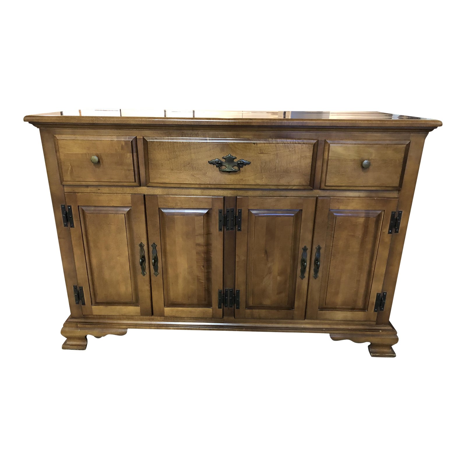 Design Plus Gallery presents a traditional sideboard by Keller Furniture. Crafted in solid woods and veneers. Three pullout drawers with dove tail joinery. Four swing open doors with a single fixed shelve. The hardware are iron with a bronze finish. Visible wear on surface.