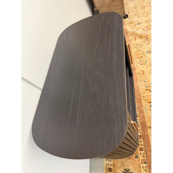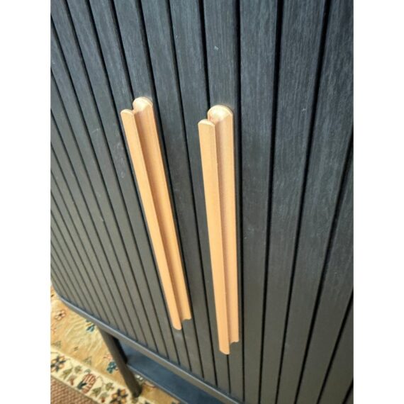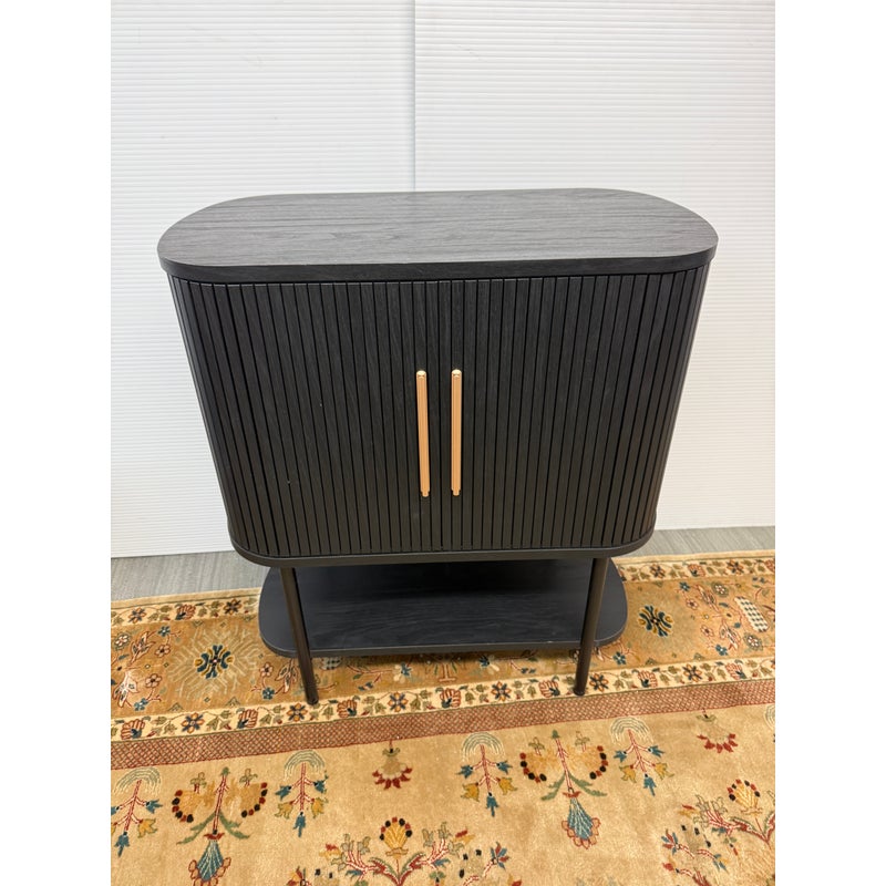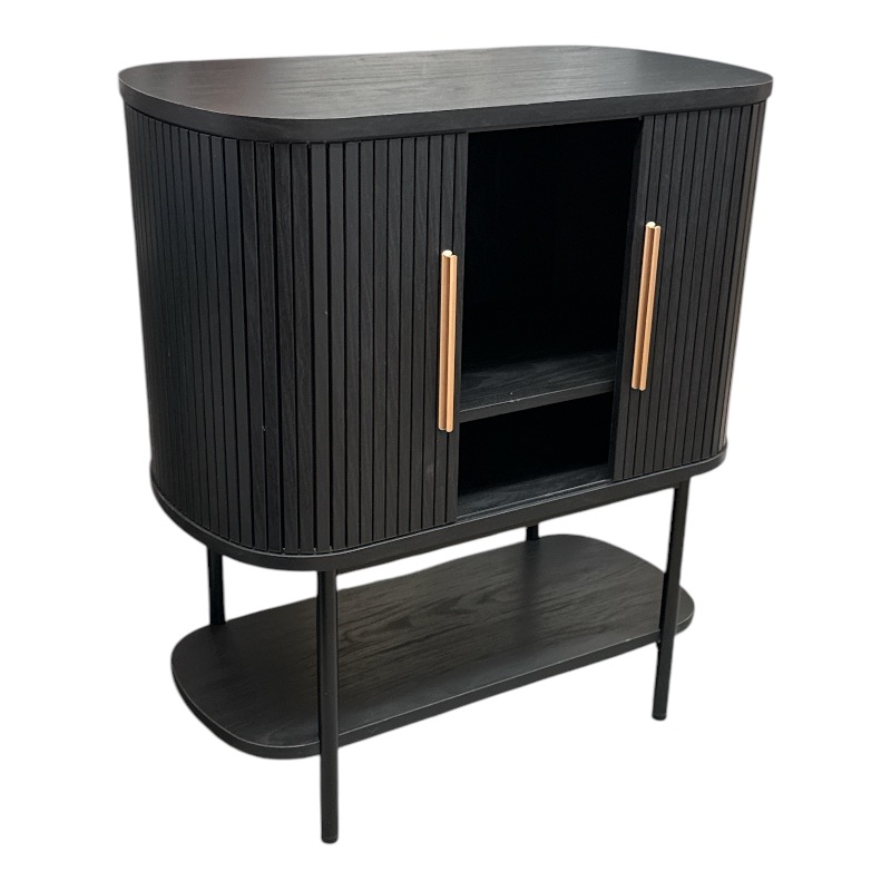 Design Plus Gallery presents a Jaylond Collection Accent Cabinet from Kelly Clarkson Home. Crafted with a meticulous mixed material composition, the Jaylond cabinet redefines durability and stability. Unlike others, its hidden metal structure ensures unparalleled sturdiness, providing a secure foundation for your prized possessions. Reinforced by metal iron powder coating legs, this stand offers unrivaled support and creates a bold and contrasting look. To ensure seamless functionality and effortless user experience, sliding track with protrusion is specially engineered to glide effortlessly. The cabinet has large storage space with a large depth, sufficient to place alcohol or wine bottles, making it a perfect hosting companion. The external shelves also give additional storage space to our user which is not limited by the internal storage space of the cabinet. It is in good overall condition with wear that is consistent with usage.