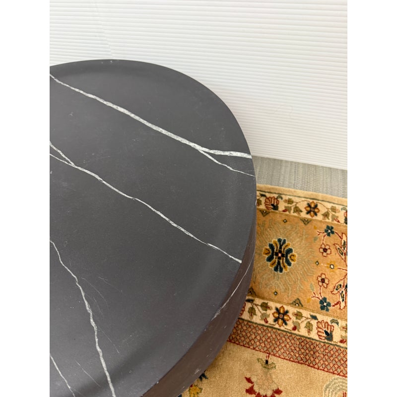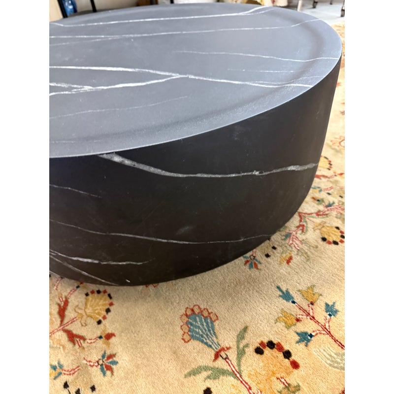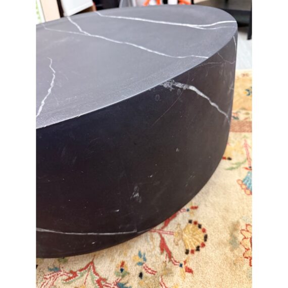 Design Plus Gallery presents the Vozelle Coffee Table from Kelly Clarkson Home. With a simple, elegant design, this round fiberglass coffee table is a standout choice for your living room setup. It has a faux marble look in a dynamic hue of your choice to bring a classical vibe to your space. This table strikes a drum silhouette with recessed edges to help protect the contents on top. The sizable surface is a great place to keep a spread of magazines or a stack of coasters for your favorite beverages. It is in good overall condition for its usage.