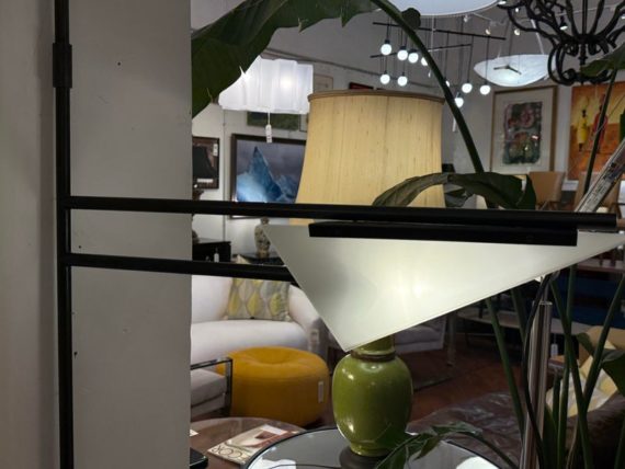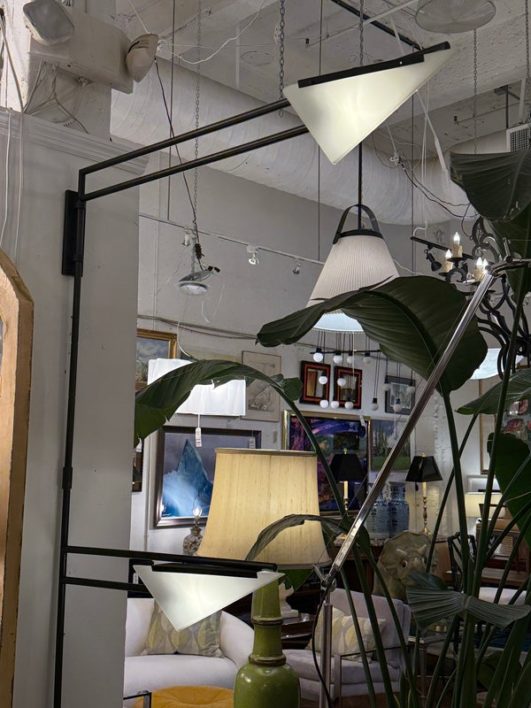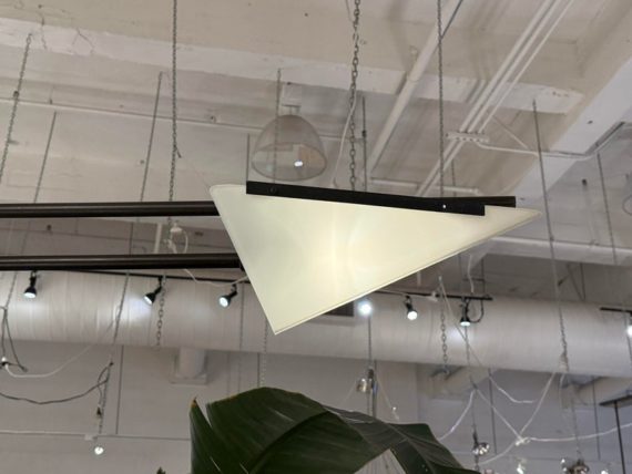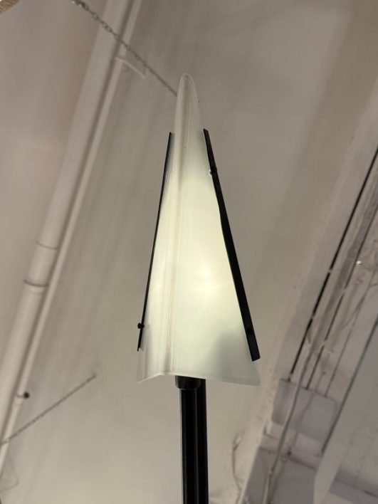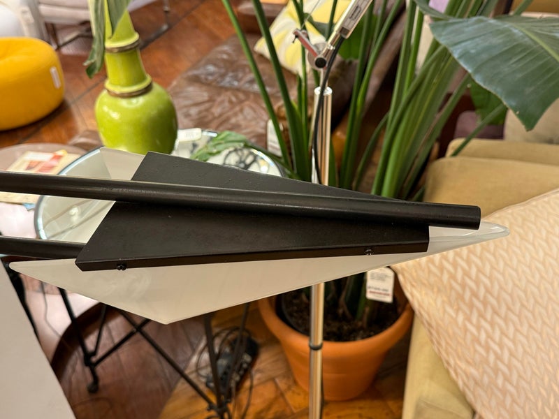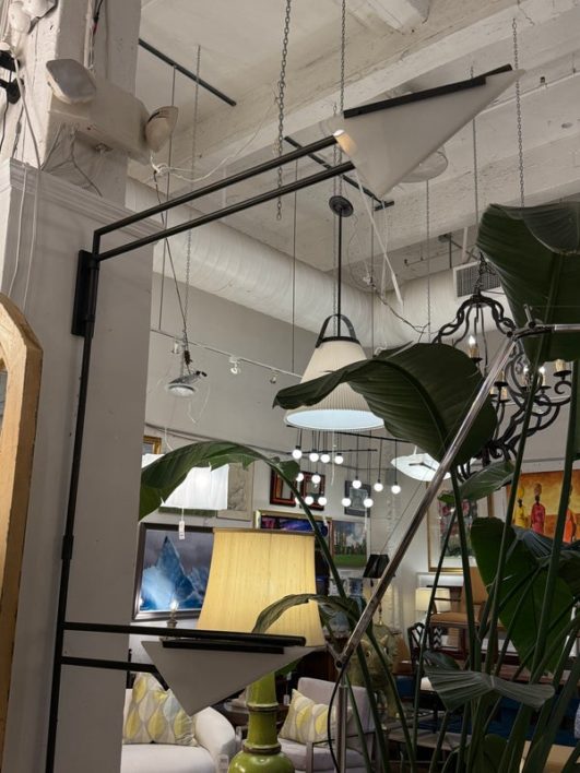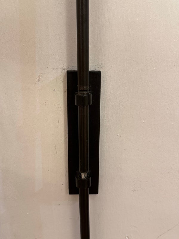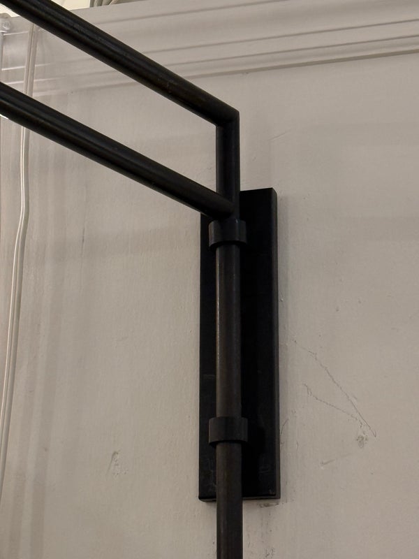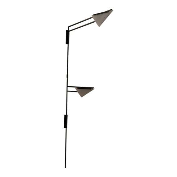 Design Plus Gallery presents a Matte Black Double Arm Wall Sconce from Visual Comfort Designed by Kelly Wearstler. A thin rod supports two swing arms that house dimensional light fixtures that are spear shaped; the top one reaching longer and the lower has a shorter. Is in good condition, with minimal signs of wear. This is a discontinued model.