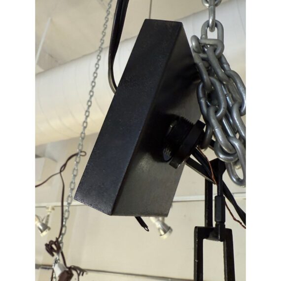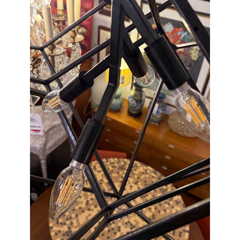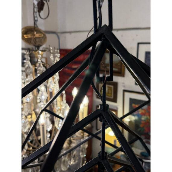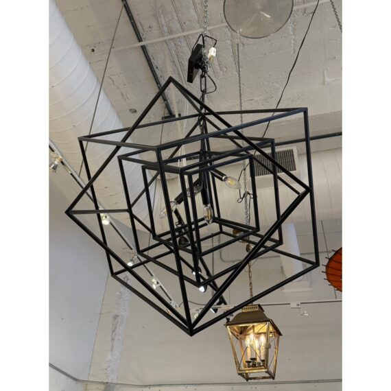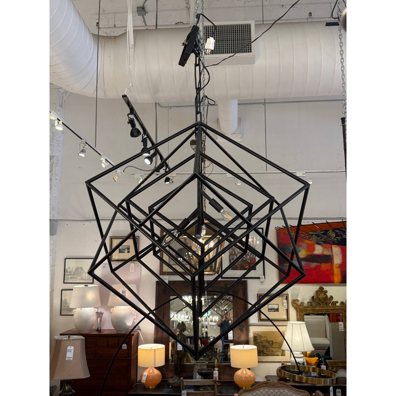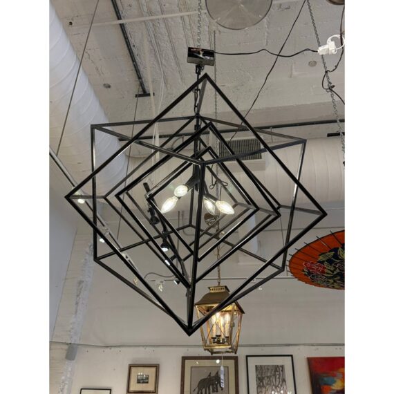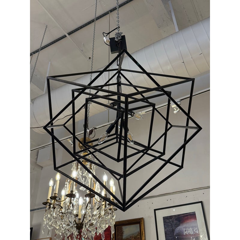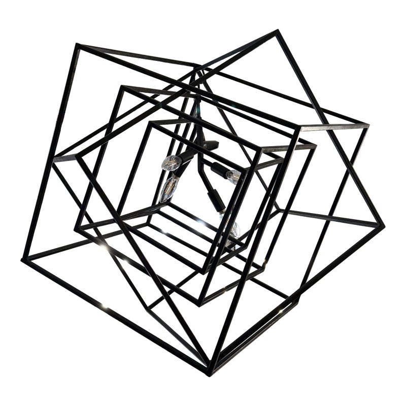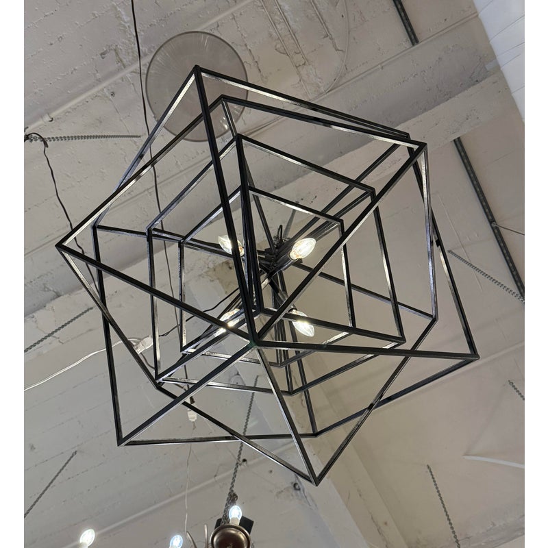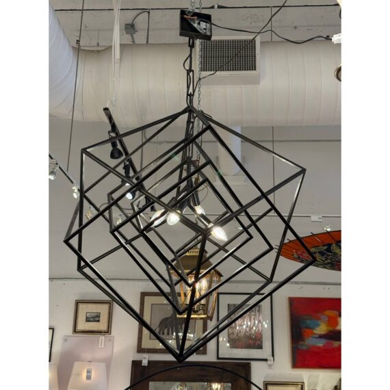 Design Plus Gallery presents the Large Cubist Chandelier Designed by Kelly Wearstler for Visual Comfort. Influenced by modern art, Kelly Wearstler’s bold Cubist series pays tribute to abstract forms and negative space in metal and glass. The three-dimensional sculptures superimpose square forms to create suspended geometry with an interplay of light and shadow. The chandeliers will add a chic touch to interior spaces. The finish is in blackened steel. Overall the light fixture is in good working condition with glass panels removed from the center.