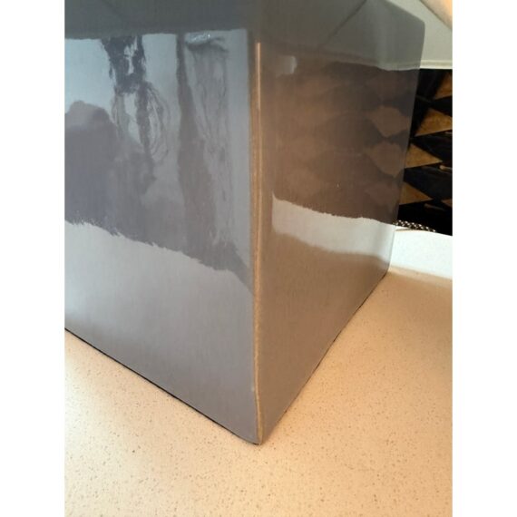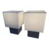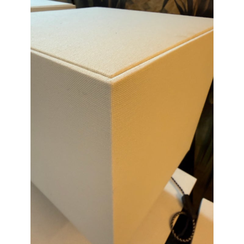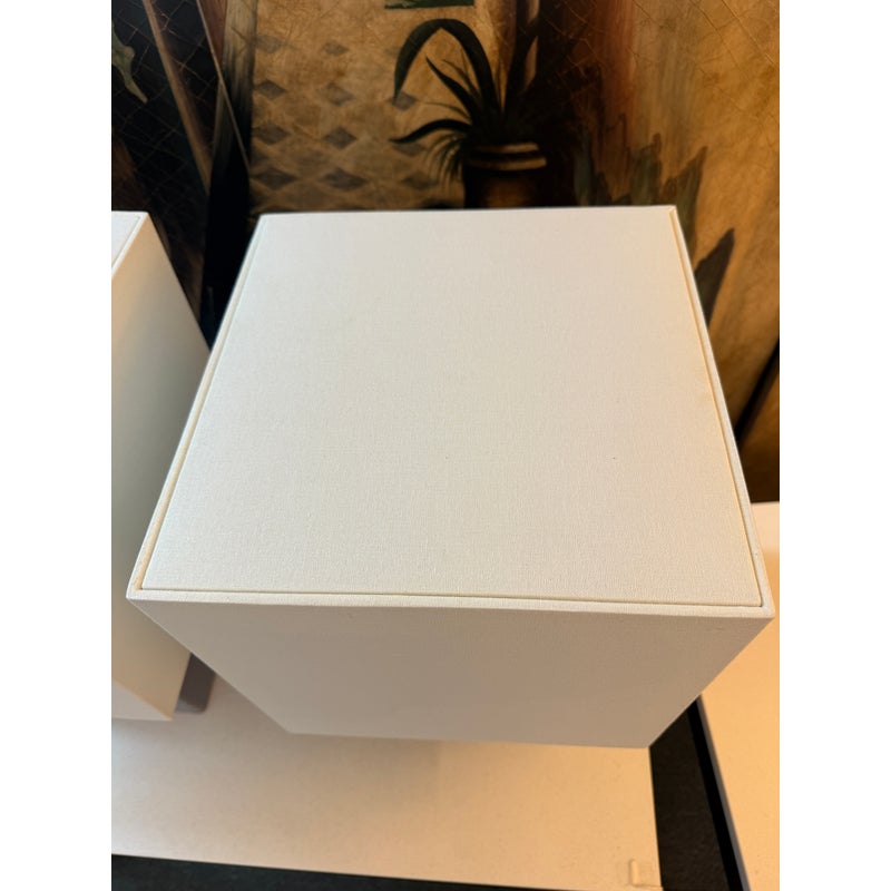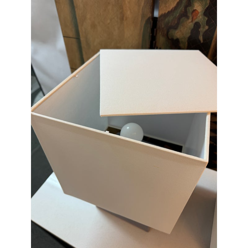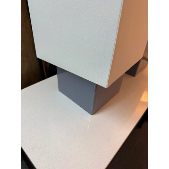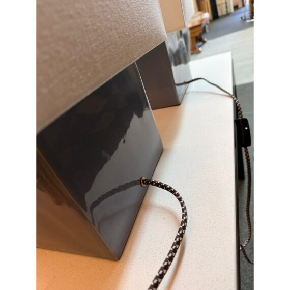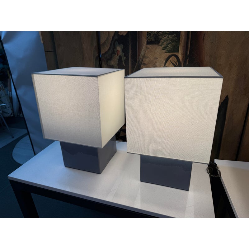 Design Plus Gallery presents a Pair of Pari Table Lamps by Kelly Wearstler for Visual Comfort. The low and block profile is softened by the perfectly imperfect texture and warm dove gray hue. Cube linen shades have diffuser on the top for ambient lighting. Switch on cloth covered cord. In good condition, visible and minimal wear from usage.