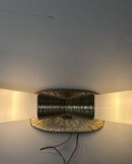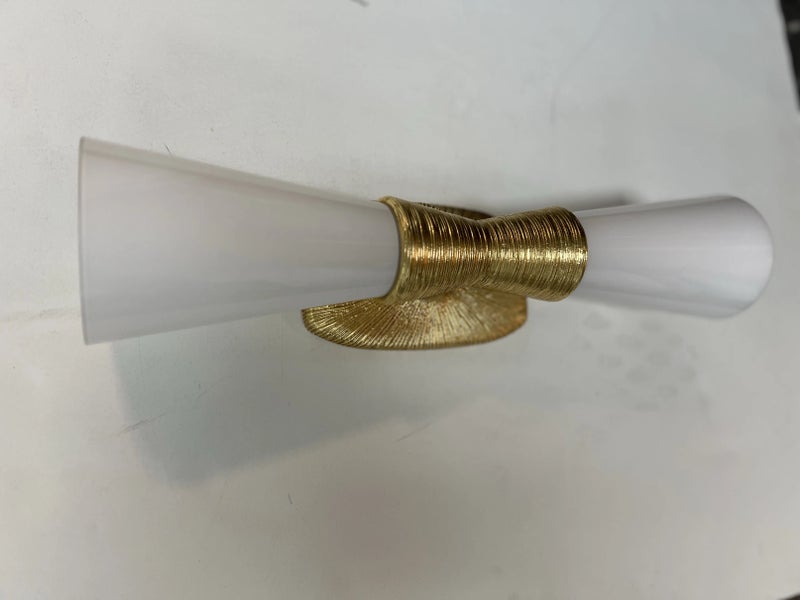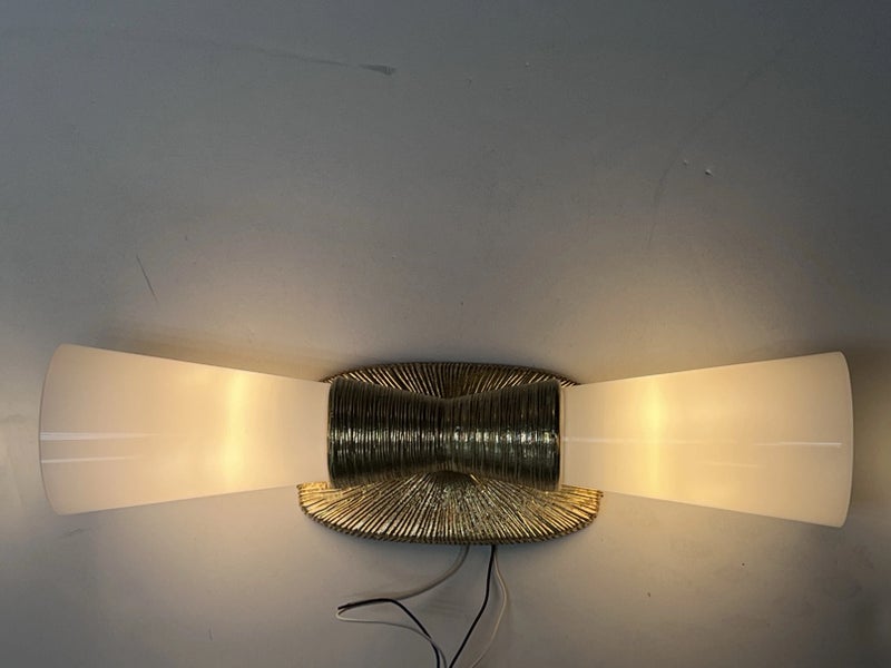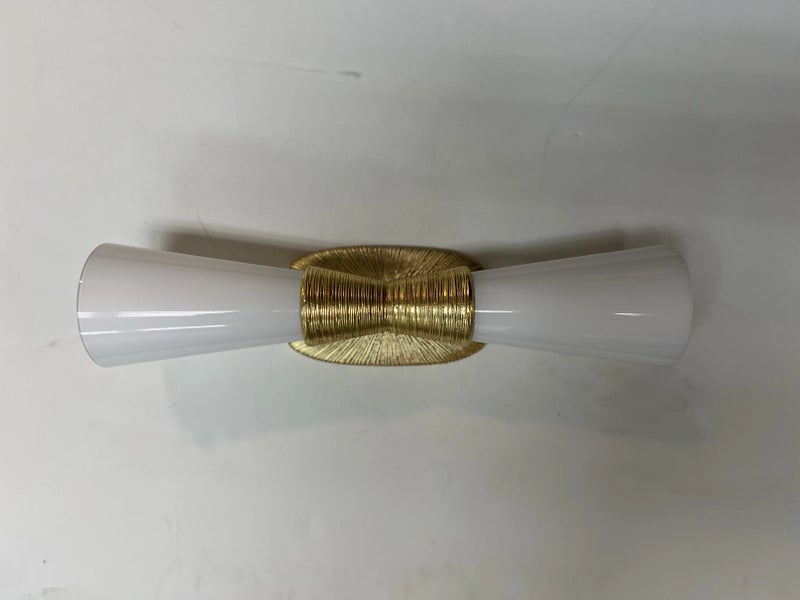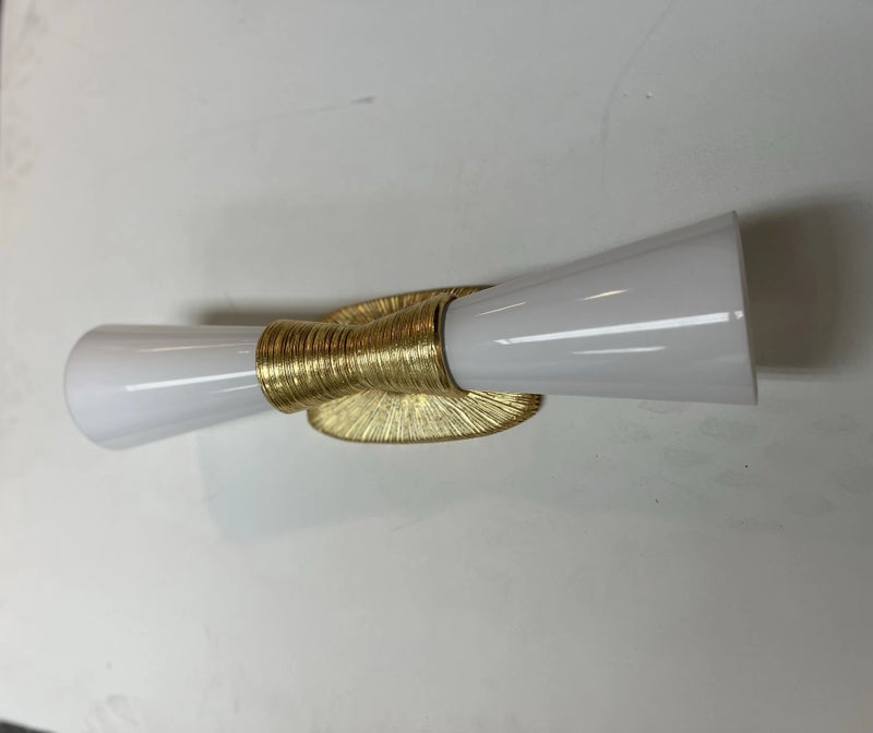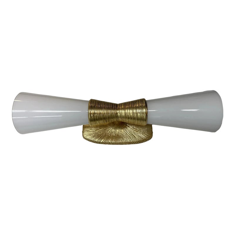 Design Plus Gallery presents the Utopia Double Sconce from Visual Comfort/Kelly Wearstler Designed. Utopia draws inspiration from the Californian coast. Transforming the landscape’s topographic textures and organic forms into carved, striated metal of different finishes with white glass the Utopia Sconce has unlimited decorative possibilities. Is in good condition for its age with visible and minimal surface wear that is consistent with use.