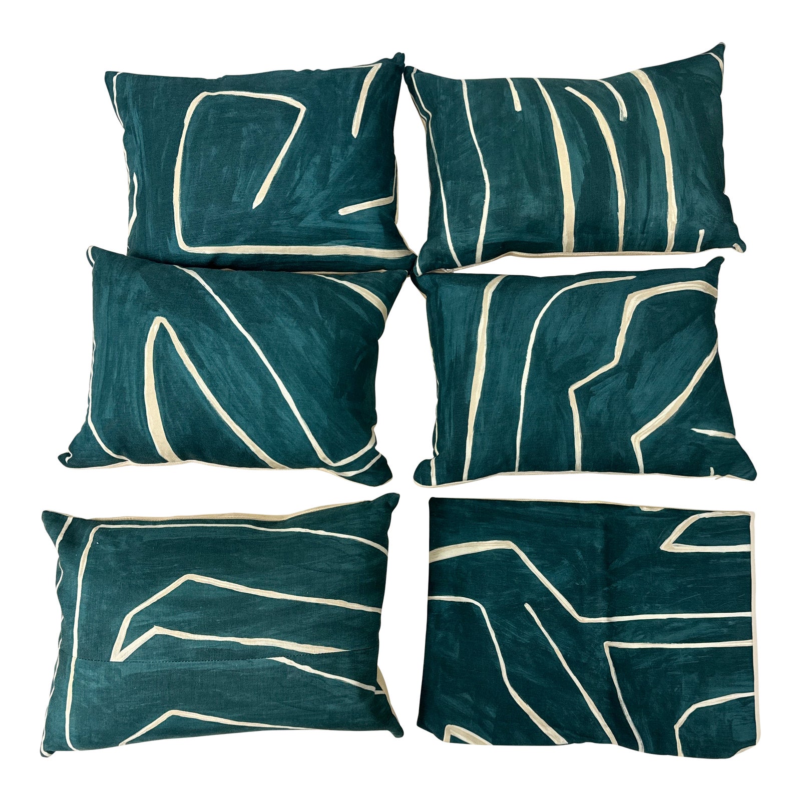 Design Plus Gallery presents a Set of Six Aegean Sea Graffito Throw Pillows by Kelly Wearstler. These beautiful throw pillows feature an abstract hand dyed washed creamy ivory print on a washed Aegean Sea (teal) background. A perfect way to accent your living room, family room, or bedroom, couch, sofa, or loveseat with a pop of color. Five of the six have the pillow inserts and one has cover only. They are all in good condition being that they were on used in home staging.