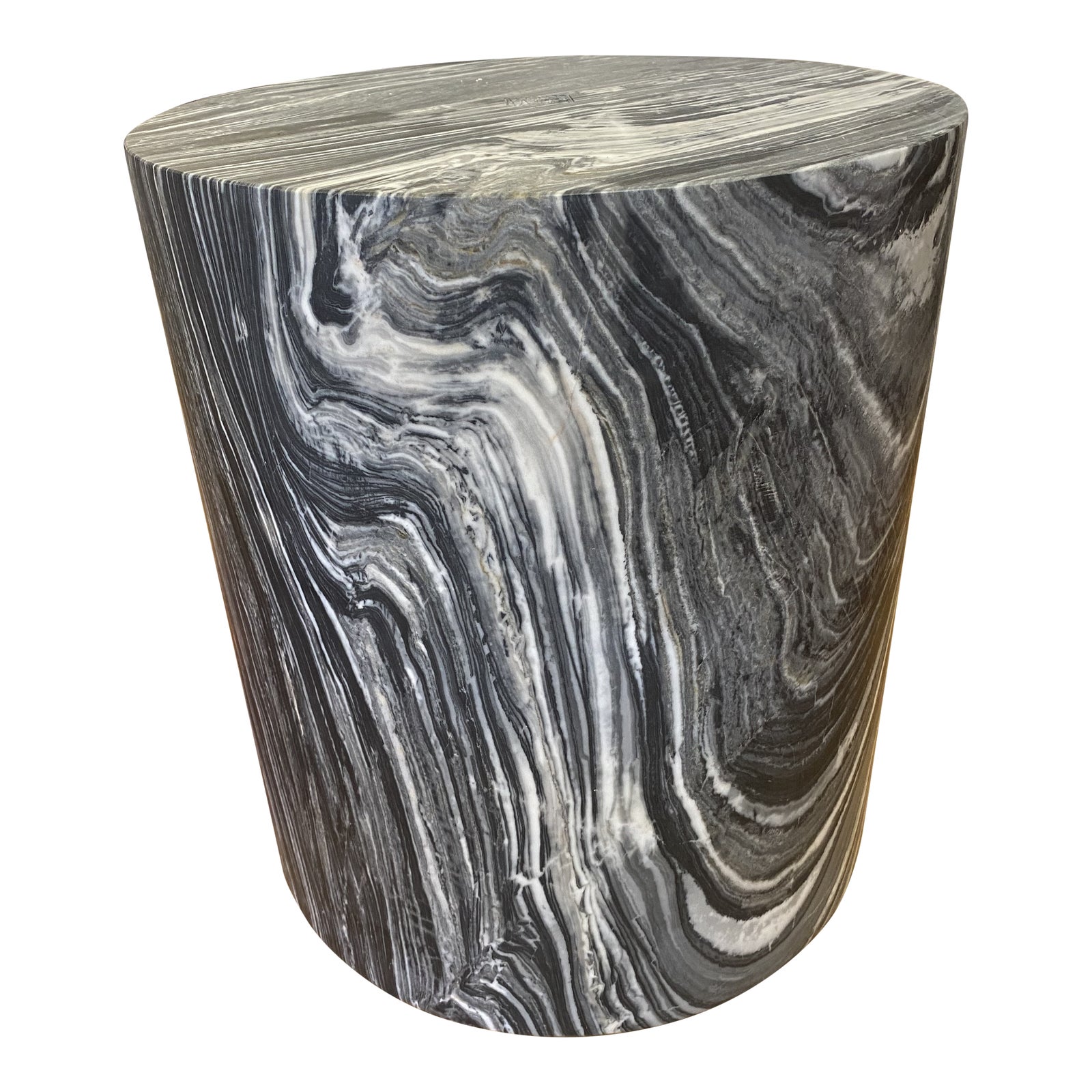 Design Plus Gallery presents a New Monolith Marble Side Table. The color is Grey Rainbow. Hand-sculpted out of a block of solid marble, this simple, versatile design can be used as a seat, plinth, or an occasional table and is perfect for a shower or garden. The cylindrical form is an exceptional canvas to highlight the rich veining, deep texture, and smooth finish of the marble.