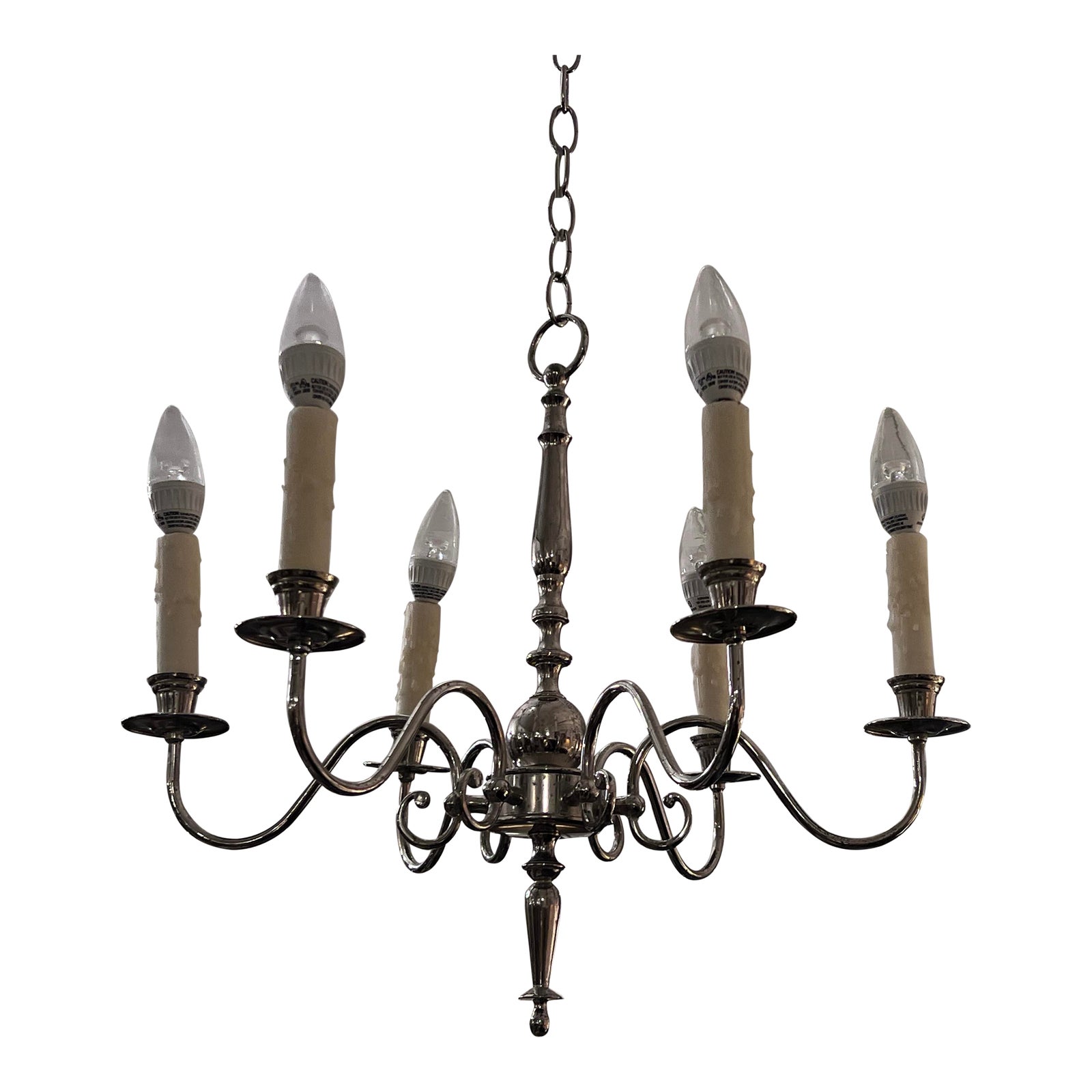 Design Plus Gallery presents a Simple Classic Dutch Design Chrome Chandelier that is from our Exclusive Kendall Wilkinson Interior Design Collection. Six equally spaced arms scroll from the urn shaped centerpiece. The Arms have nice recesses for what were candle placements but are now produced to resemble candles. In good vintage condition.
