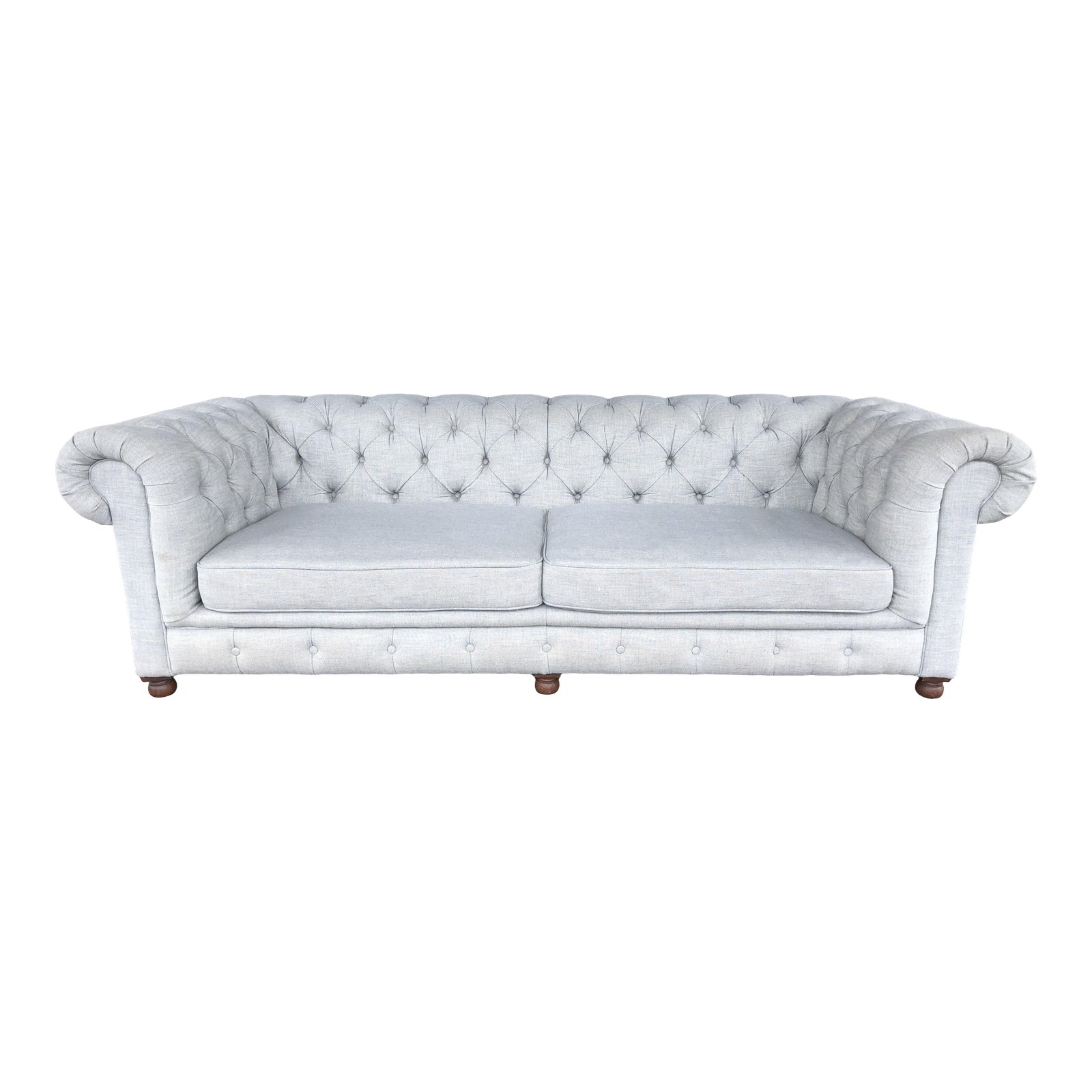 Design Plus Gallery presents the Kensington Sofa by Restoration Hardware. Luxe depth, the Fog hue Linen fabric with deep tufting and solid oak bun feet creates an invitation to lounge. The Kensington has luxurious rolled arms and self welting. Crated of kiln-dried hardwood, sinuous springs and poly fiber/foam cushion fill frame with down wrapped seat cushions.
