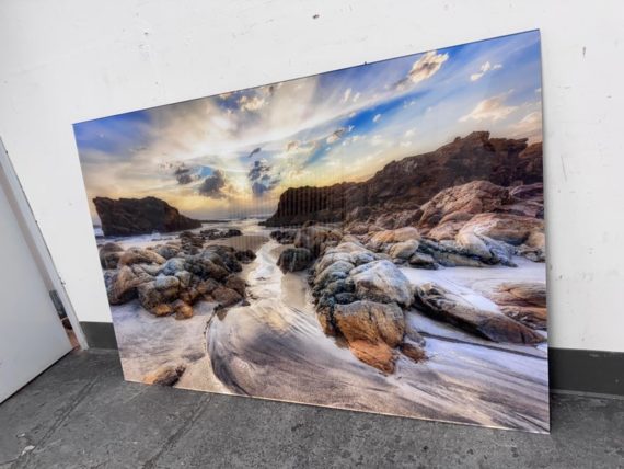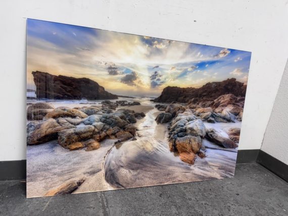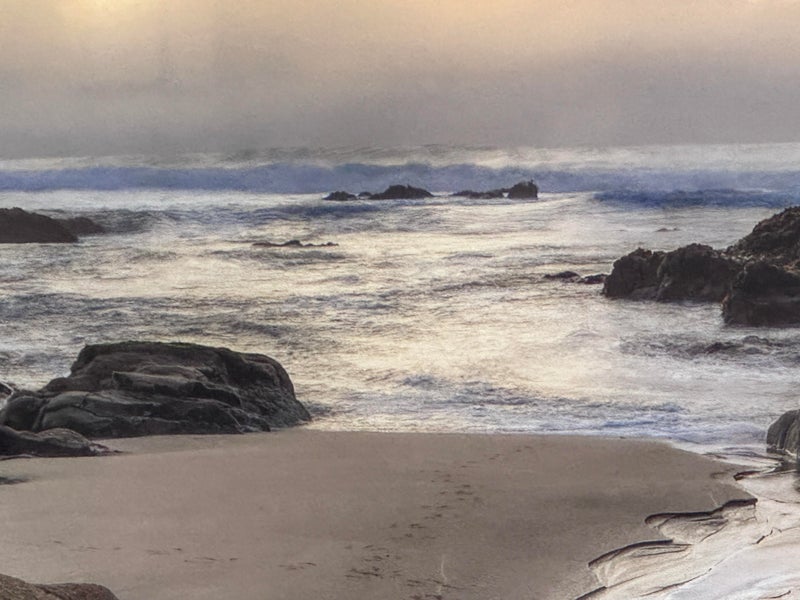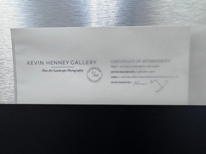 Design Plus Gallery presents a Metallic Photograph Print “October Storm Break, Pescadero” by Kevin Henney. The image is of Half Moon Bay mounted in acrylic. Archival print, face mounted on acrylic. Edition 2/25. In good condition, minimal wear.