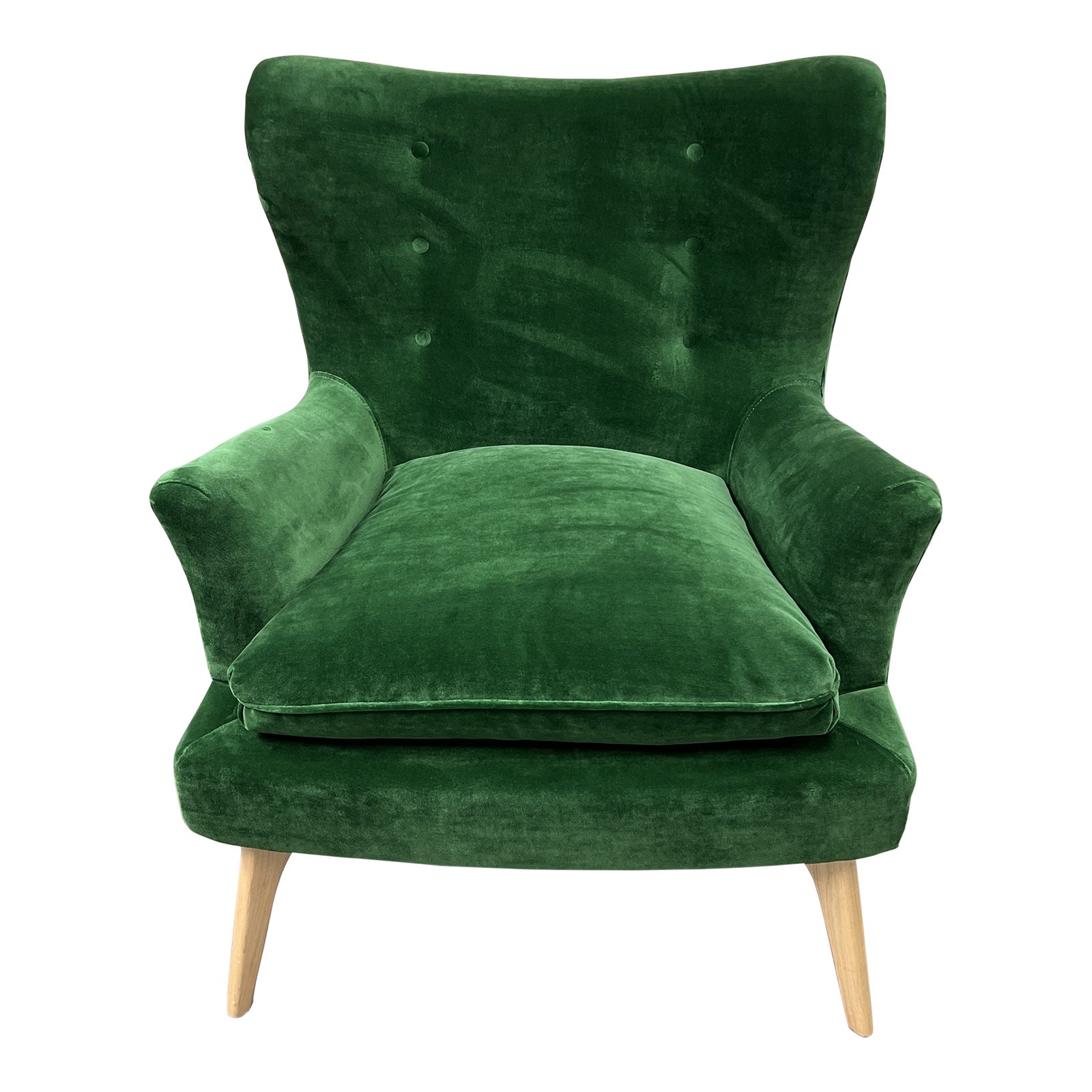 Design Plus Gallery presents the Sonja Chair in Emerald Velvet by Kim Salmela Atelier. The bright jewel green velvet gives this ’60s-inspired chair its inviting appeal. Tufted buttons on the seat-back, flared arms and tapered legs make it retro + charming. The seat fill of high-resiliency foam surrounded by feathers and down ensures long-lasting comfort. In good condition, minor wear. Made in USA.