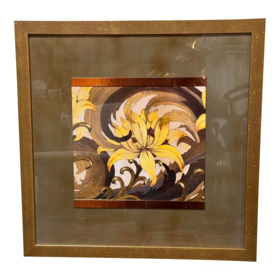 Design Plus Gallery presents an Abstract Floral Print by Kinder Harris. A crisp graphically presented bloom in spectacular color, the print is double matted and antique framed to wonderful effect. Light surface wear; condition is good for age and use.