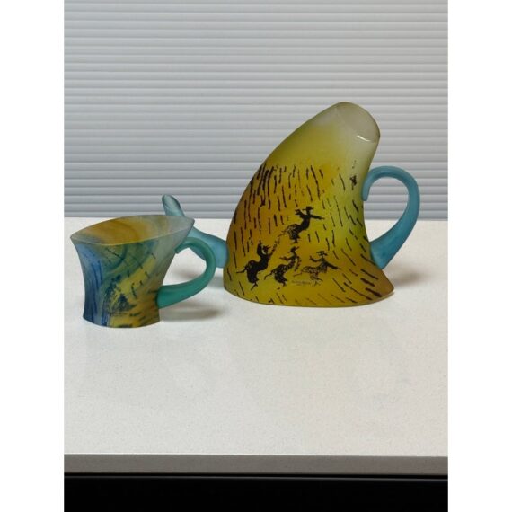 Design Plus Gallery presents a Vintage Limited Edition Teapot + Tea Cup Art Glass Sculpture by Kosta Boda. The vintage pair, designed by Kjell Engman, offer a whimsical perspective on everyday objects. The playful, luminous pair practically dance across your display, reflecting the artist’s musical background. Handblown in Sweden. Numbered and signed by artist. In good condition, visible and minimal wear.