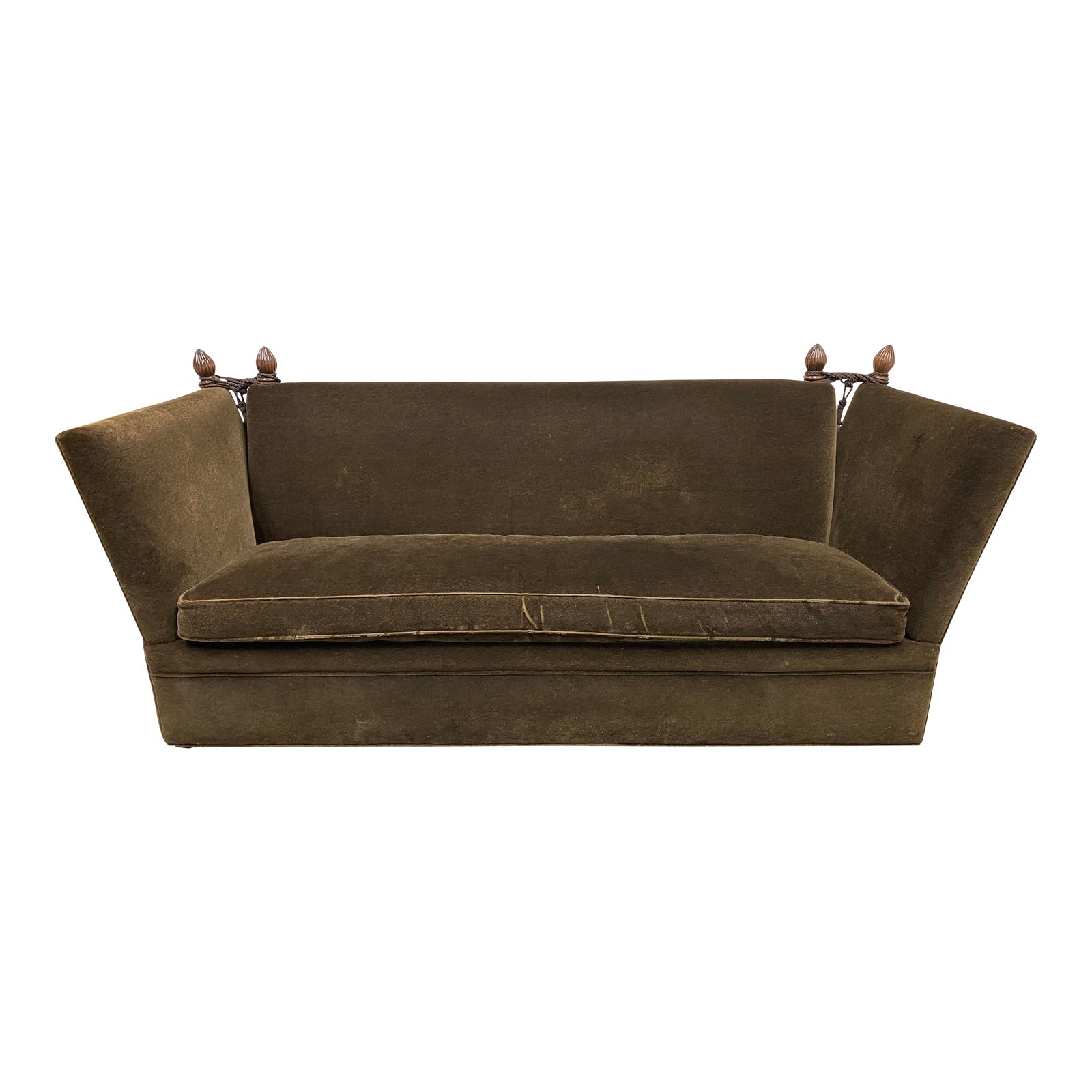 Design Plus Gallery presents a Custom Knole Custom Mohair Sofa. Solid wood frame has th signature adjustable arms with leather wrapped finials and cording. Visible wear throughout the frame and within the mohair (pictured). Bench seat is down filled and reversible. Doesn’t come with back cushions. Originally purchased from the San Francisco Design Center.