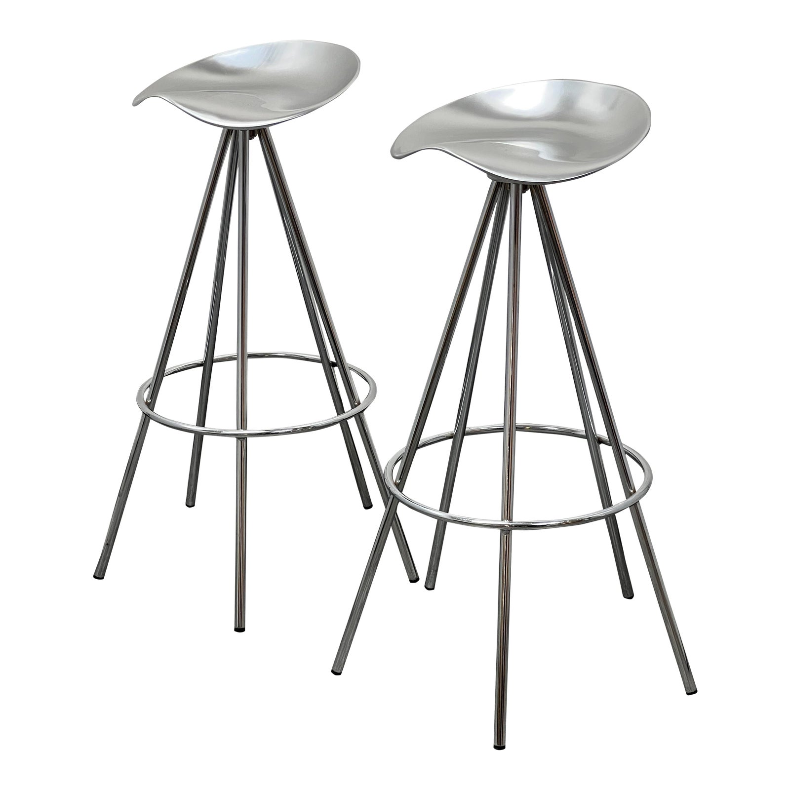 Design Plus Gallery presents a Set of Two Jamaica Barstools by Knoll. Manufactured by Amat-3 Furniture, designed by Spanish Designer Pepe Cortés in 1991. Intended for use in a multitude of environments both commercial and residential. Cortés with experience in the realm of hospitality wanted to design a stool, an essential piece of seating, that was both function and elegant. A durable polished aluminum build, sculpted organic seat and its 360° swivel capability. Each stool’s underside has a stamp of authenticity. Minor wear on the finish. Made in Spain.
