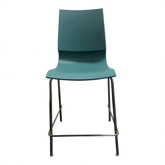 Design Plus Gallery has a Gigi Counter Stool by Knoll. The seat is in a Aqua Blue polypropylene with a chrome-plated base. Designerd by Marco Maran, known for pieces that are spirited and flexible, a description embodied by the bright and bold Gigi Collection. Manufactured by Knoll according to the original and exacting specifications of the designer. Flexible back and waterfall seat edge provide enduring comfort in a lightweight plastic stool. Armless design and three-sided footrest allow for numerous seating positions. The chair shows sun damage. Seat Height: 24 inches. Made in U.S.A.