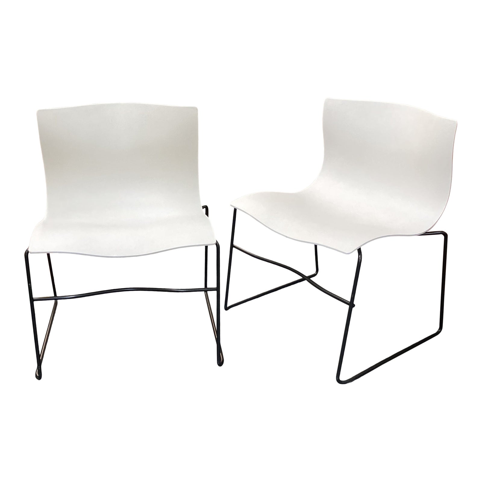 Design Plus Gallery presents a Pair of Handkerchief Chairs by Knoll. Designed by Lella & Massimo Vignelli in 1983. Vignelli Designs brought elegance and design to the too-often styleless high density stacking chair with Handkerchief. Intended to evoke the windblown contours of a handkerchief floating through the air, the generously scaled, ergonomically sculpted shell offers spacious comfort and ample support. The seat shell is compression-molded, fiberglass-reinforced polyester with a urethane paint in a white finish.The base is steel wire in a black finished. Made in USA by Knoll.