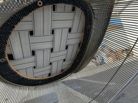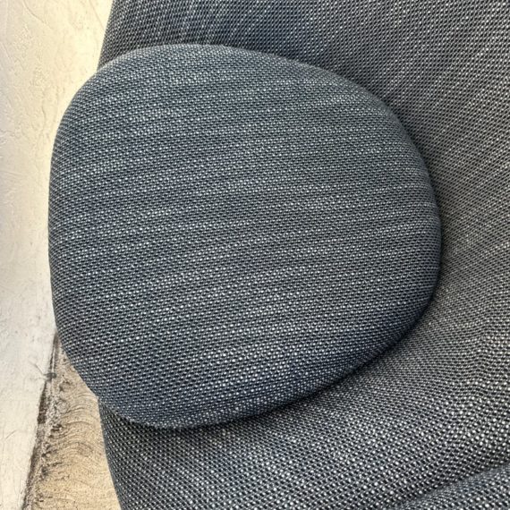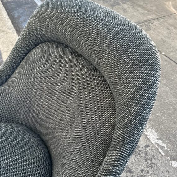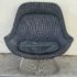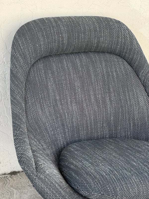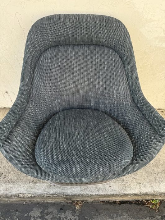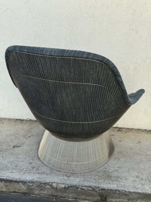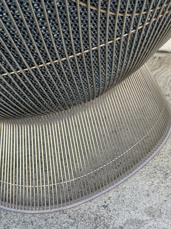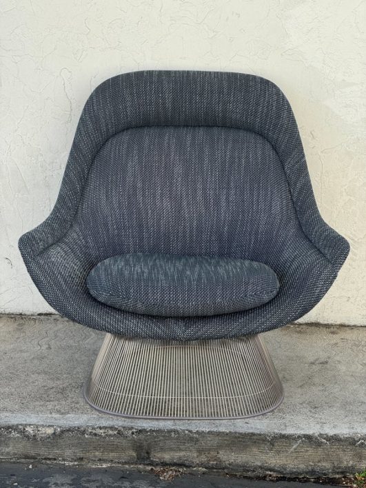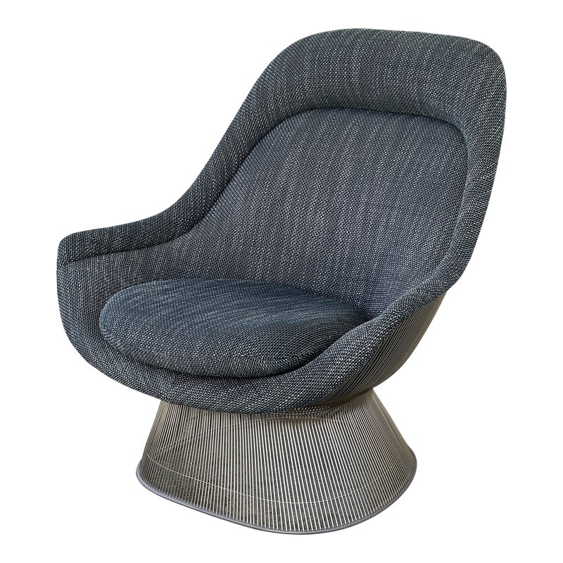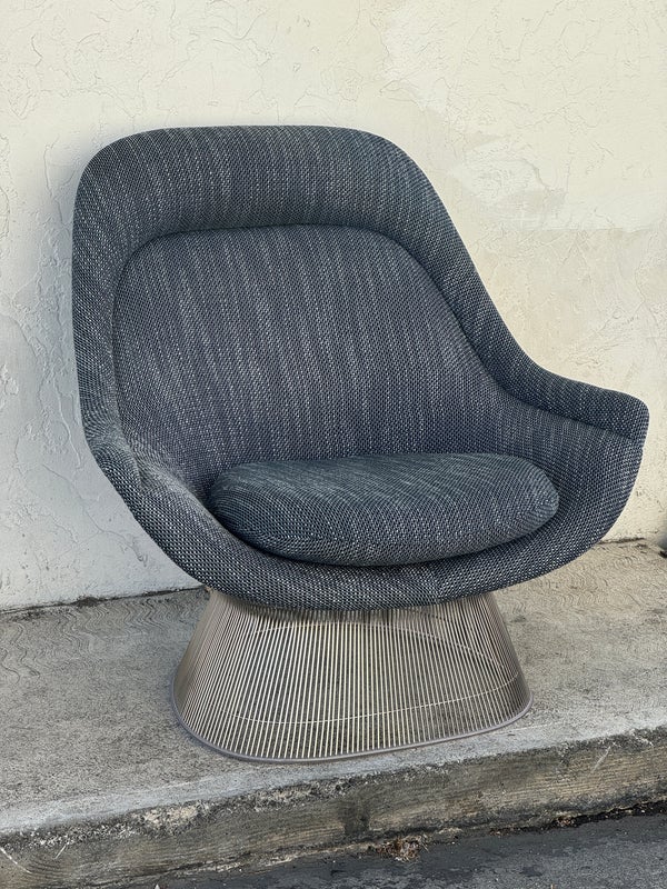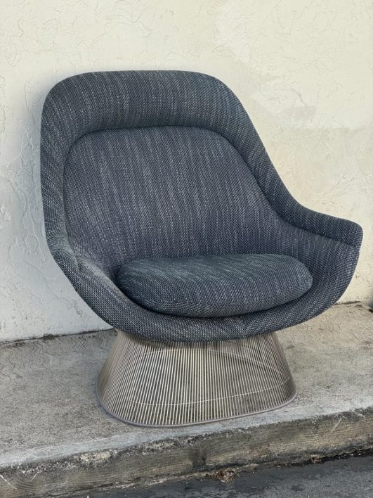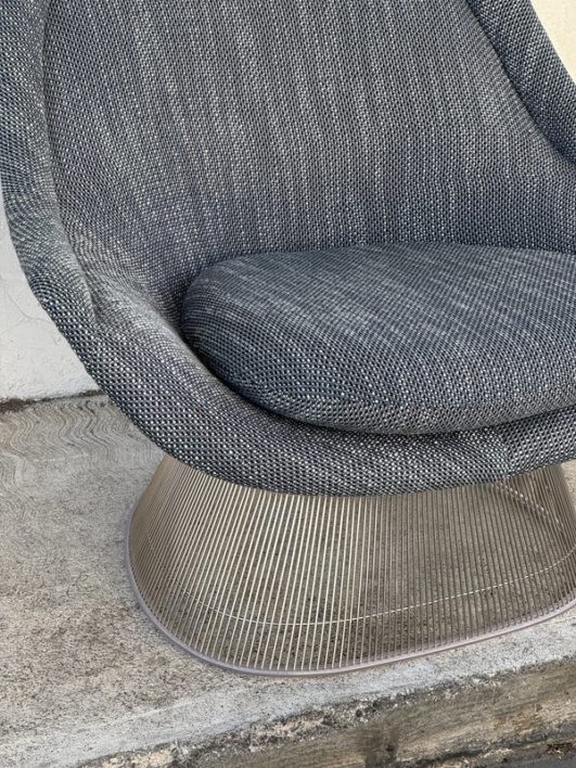 Design Plus Gallery presents an Easy Chair by Warren Planner for Knoll. In 1966 the Platner Collection captured the “decorative, gentle, and graceful” shapes that were beginning to infiltrate the modern vocabulary. This Platner lounger is the perfect example, created by welding hundreds of curved, nickel-plated steel rods to a circular frames, simultaneously serving as structure and ornament. Upholstered in textured gray/black/white fabric, loose seat cushion, over excellent cushioning for comfort. Little evidence of wear; condition is good for age and use.