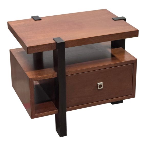 Design Plus Gallery presents a Custom Mezzanine Side Table by Knowlton Brothers, Grover Beach CA. Beautiful slabs of warm walnut with dark tobacco posts create a timeless focal pint in your room. The drawer is finished with satin brass pulls. Light surface wear; consistent with age and use.