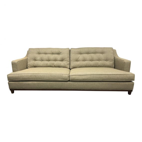 Design Plus Gallery presents a Kravet Colby Sofa Model DS3004-00 . A clean design with curved arms. Two seating cushions with two back tufted cushions. The wood is in a cappuccino finish. The cushions are duck down wrap cushions. Handmade in America. Arm Height: 26 inches. Seat Height: 18 inches.