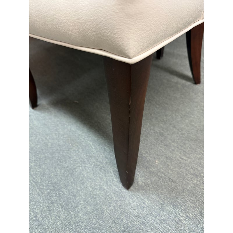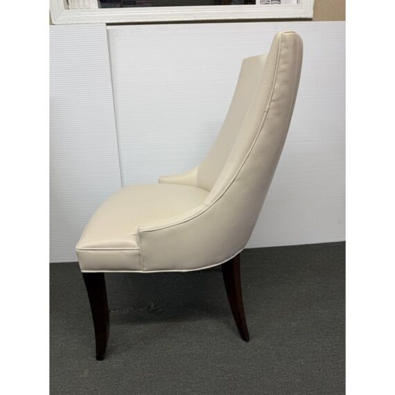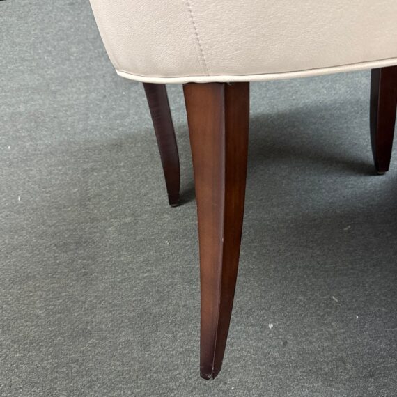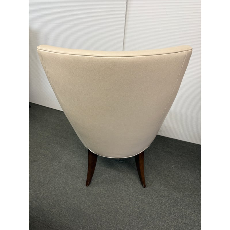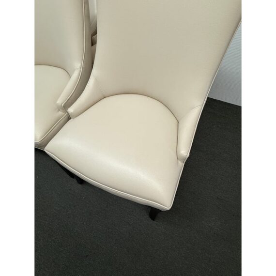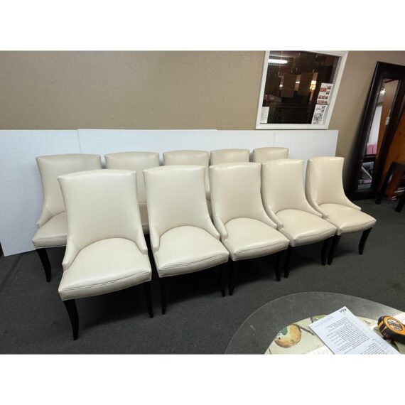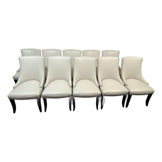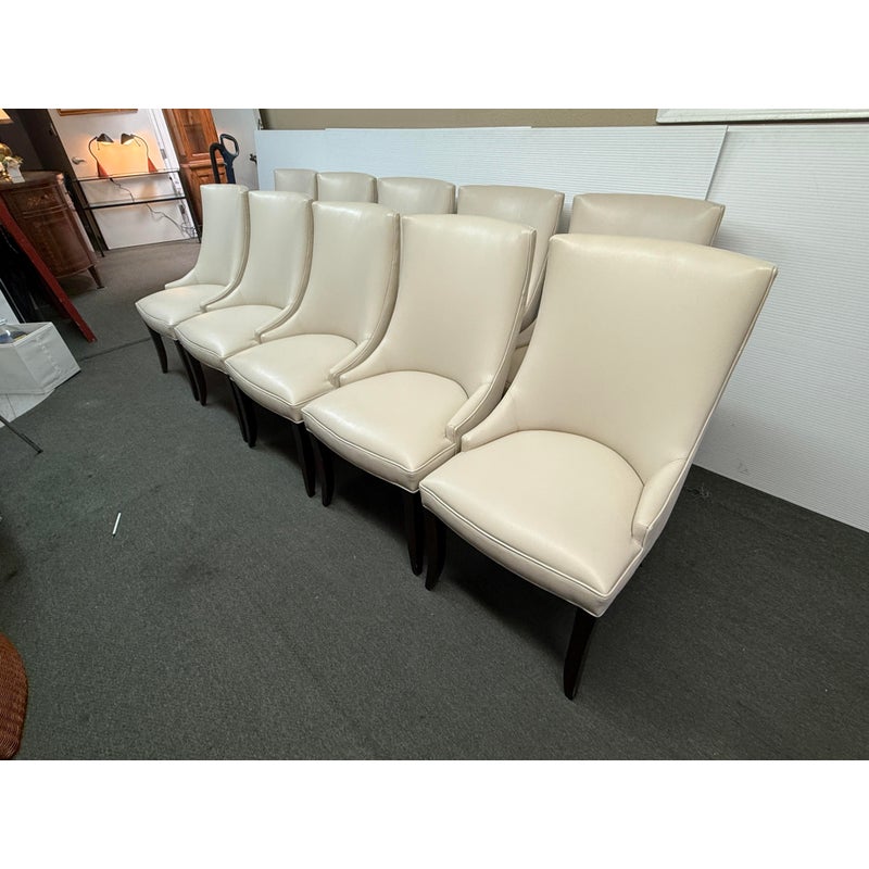Design Plus Gallery presents a Set of Ten Canterbury Ivory Leather Dining Room Side Chairs Custom Created from Kravet Furniture. Richly made in premium materials of mahogany with supple and lightly pebbled leather, these chairs will transform your dining room into a sublime experience. They are in good condition with some surface wear on legs and two seats. Made in the USA.