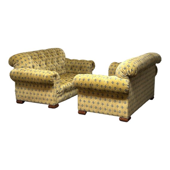 Design Plus Gallery presents a Pair of Stunning Loveseats Customized by Kravet Furniture in Yellow Velvet with a Blue Crest Pattern. Their elegant style shows off traditional in a rich elitist fabric. Swooping rolled arms and back over their frames showcase the outstanding craftsmanship. All over tufting further enriches its design. There are visible wear from sunlight and light markings to the velvet but is considered a good condition based on age + use.