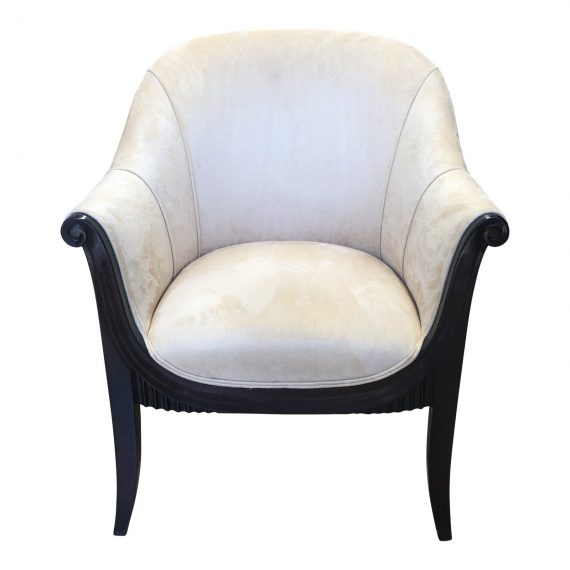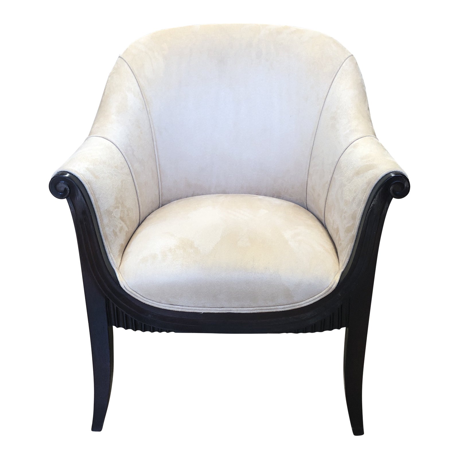 Design Plus Gallery presents a Custom Tub Chair from Kravet Furniture. A beautiful curved back with exposed wood frame. The exposed wood is in a Sable finish. A tight seat and back upholstering in a cream leather suede. Great addition for any space. Arm Height: 26 inches, Seat Height: 17 inches. Made in USA.
