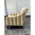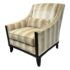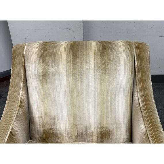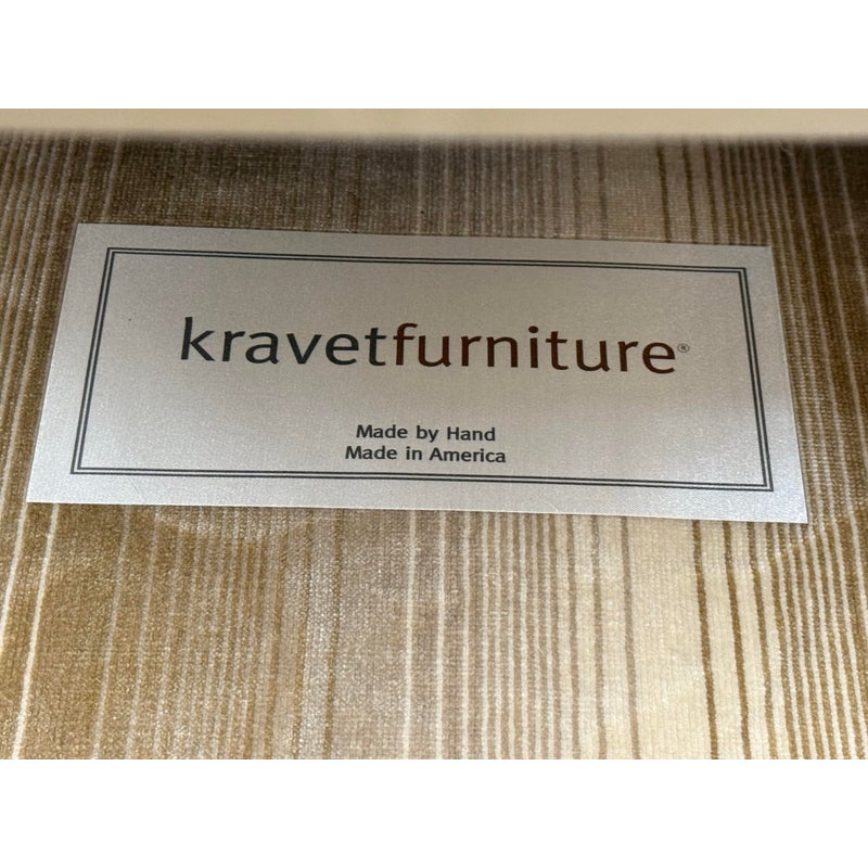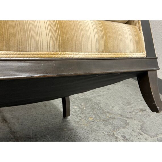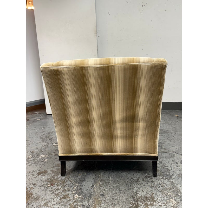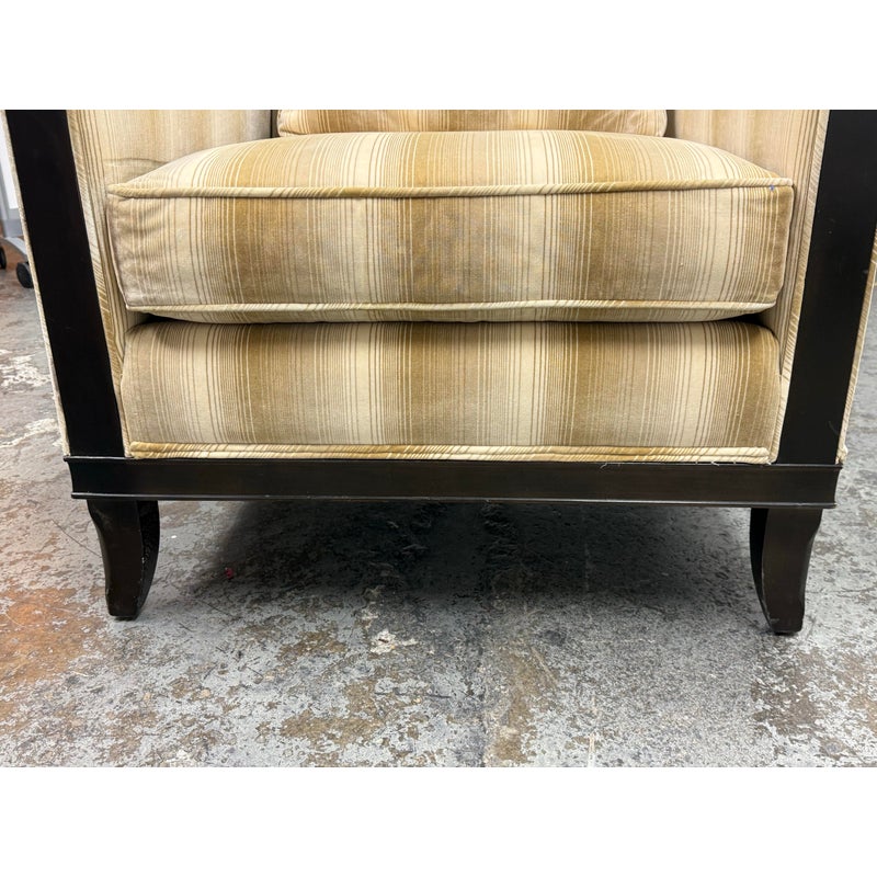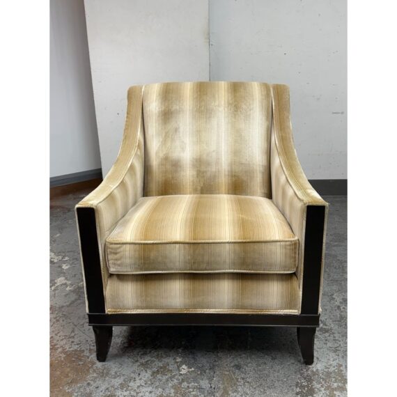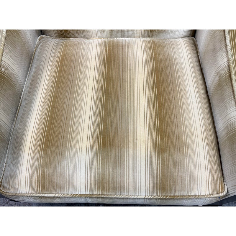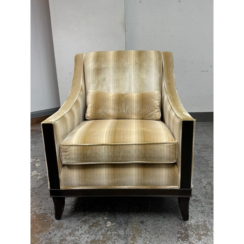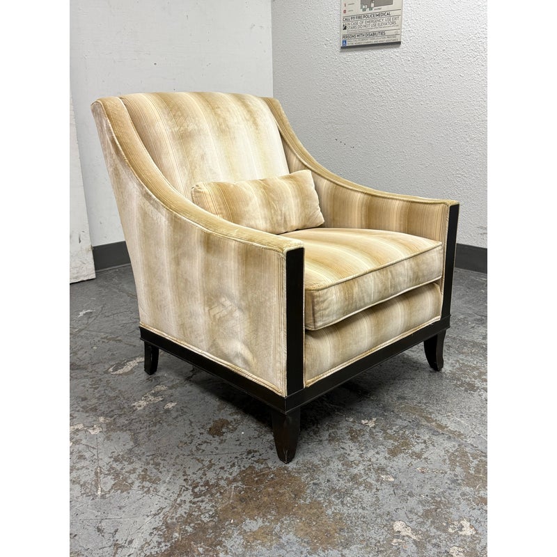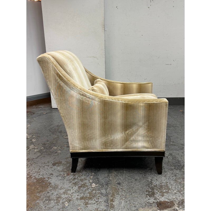 Design Plus Gallery presents the Montauk Lounge Chair of Bespoke Tailoring from Kravet. The chair has a slightly leaned back seat rest with gently sloped arms for a refined and comfortable sit. The chairs frame is in a dark wood finish with a golden striped upholstery. The upholstered frame matches the loose seat cushion and additional lumbar pillow. There are visible signs of wear to the chair that are worn, such as the fiber from sun exposure and markings to the frame. It is in good structural shape with comfort to last a decade or more. Made in USA.