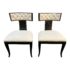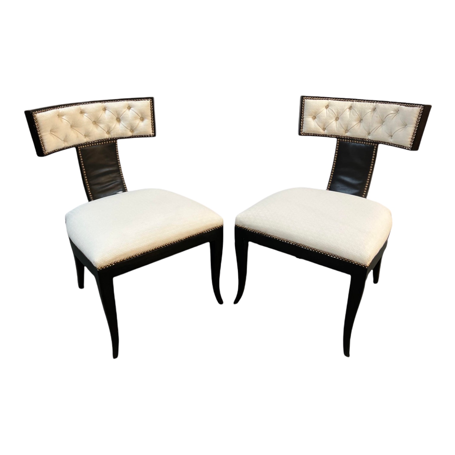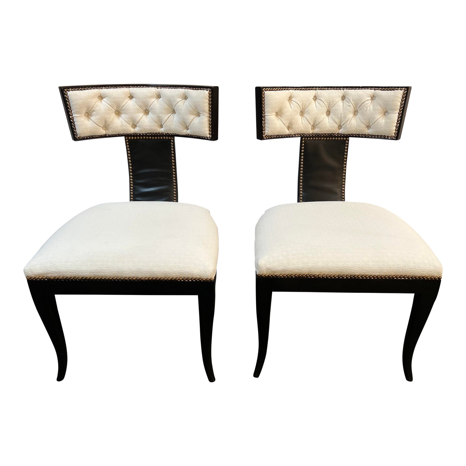 Design Plus Gallery presents a Pair of Kravet Athens Klismos chairs. A classic silhouette in tone on tone off-white jacquard, with ebony-stained maple tapered legs. The upholstery is detailed in antiqued brass nailheads, the back is wrapped in rich black leather, contrasted with nailheads. Thick cushioned seat and deep button tufting guarantees comfort.