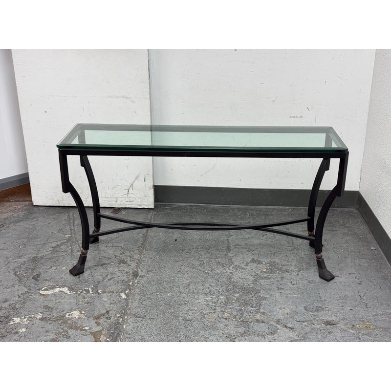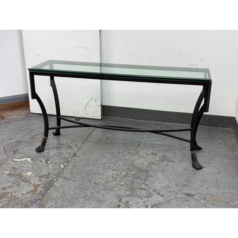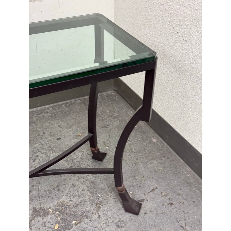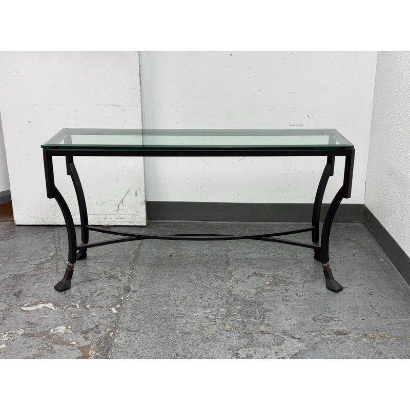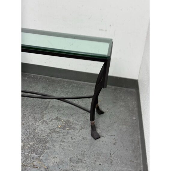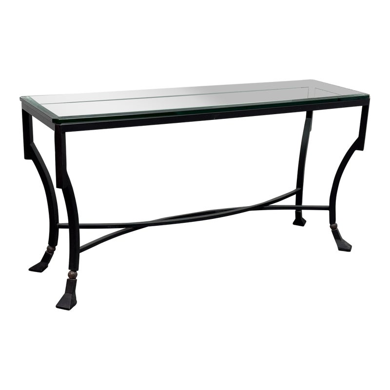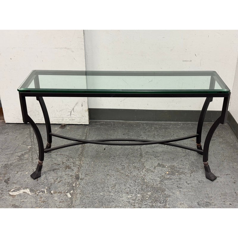 Design Plus Gallery presents the Palomino Console Table by Kreiss Collection. The striking silhouette is a combination of iron with beveled glass that maintains a light + airy style that is difficult to achieve, especially with the added benefit of complementing a range of interiors. The console is in good condition with visible wear that is consistent with usage.