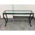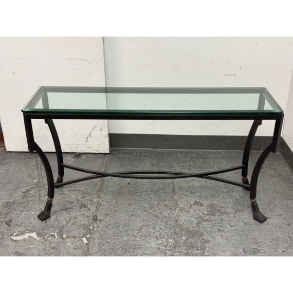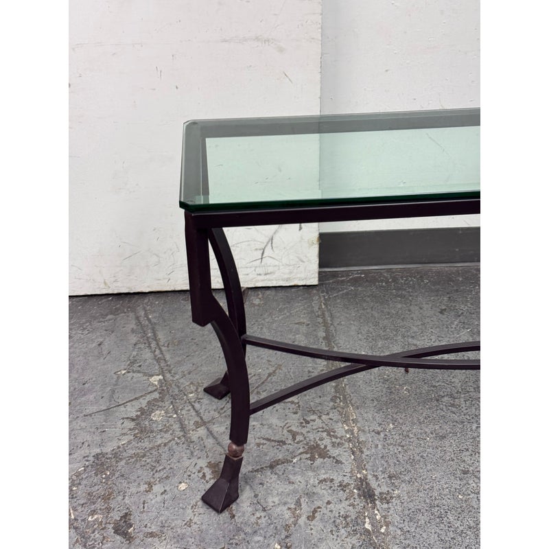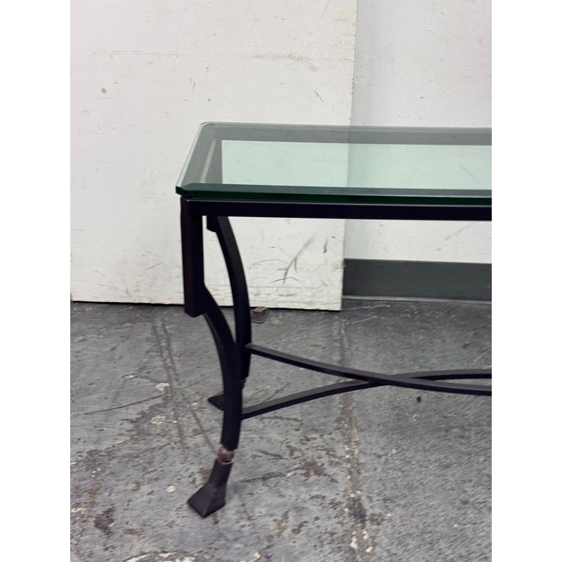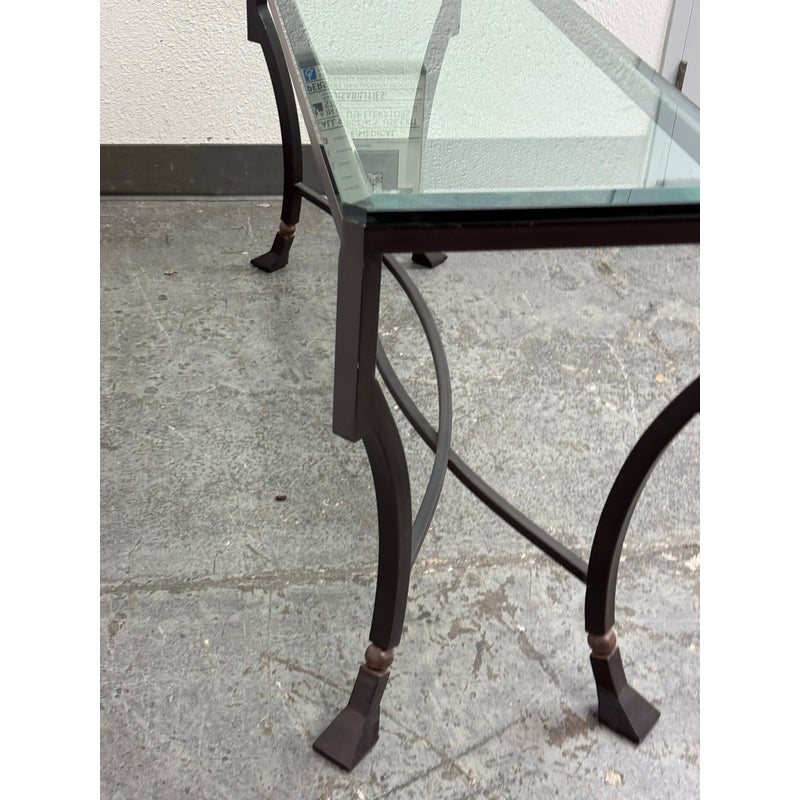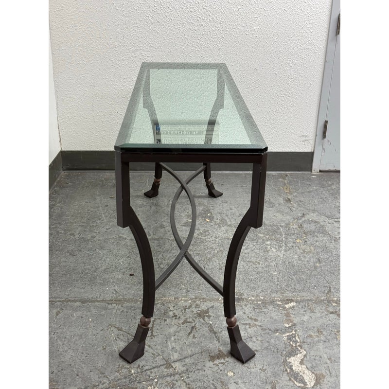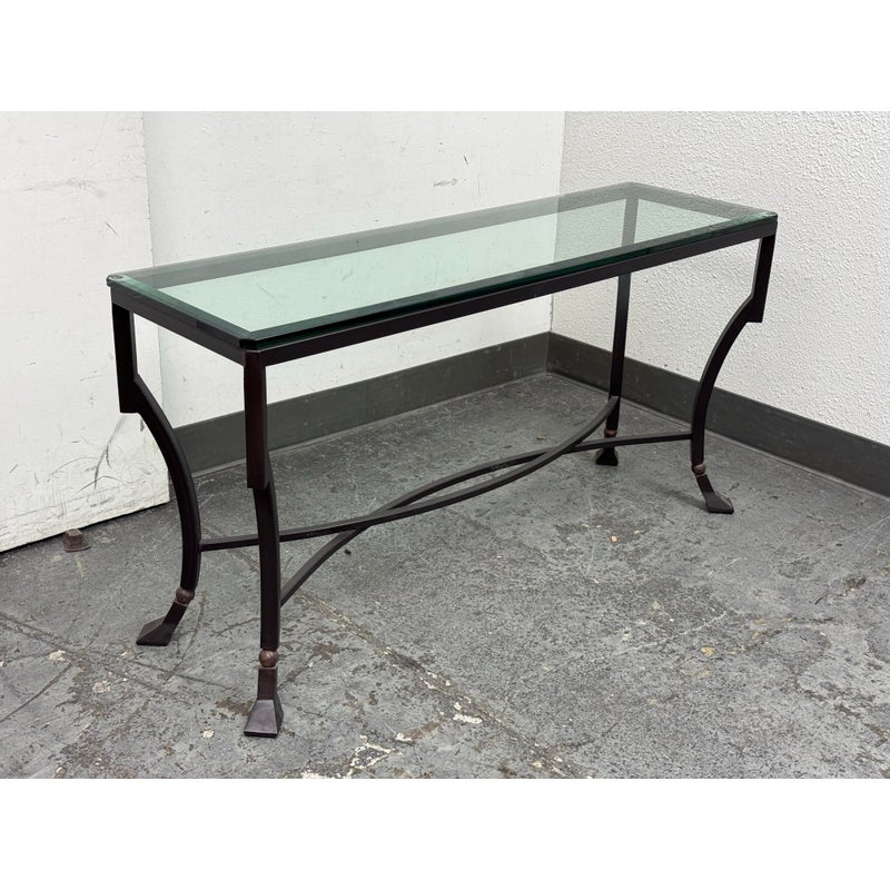 Design Plus Gallery presents the Palomino Console Table by Kreiss Collection. The striking silhouette is a combination of iron with beveled glass that maintains a light + airy style that is difficult to achieve, especially with the added benefit of complementing a range of interiors. The console is in good condition with visible wear that is consistent with usage.