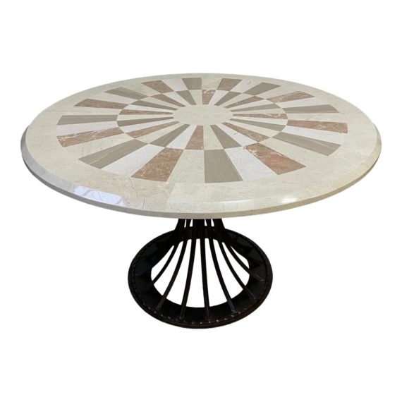 Design Plus Gallery presents a Stone Inlay Round Table by Kreiss Collection. Travertine is inter-spliced with taupe and red stone in a radiating sun formation. Table has a nice thickness with bevelled edge. Top is self stabilizing with its own weight on the metal pedestal base. There is some visible wear on the stone (pictured.)