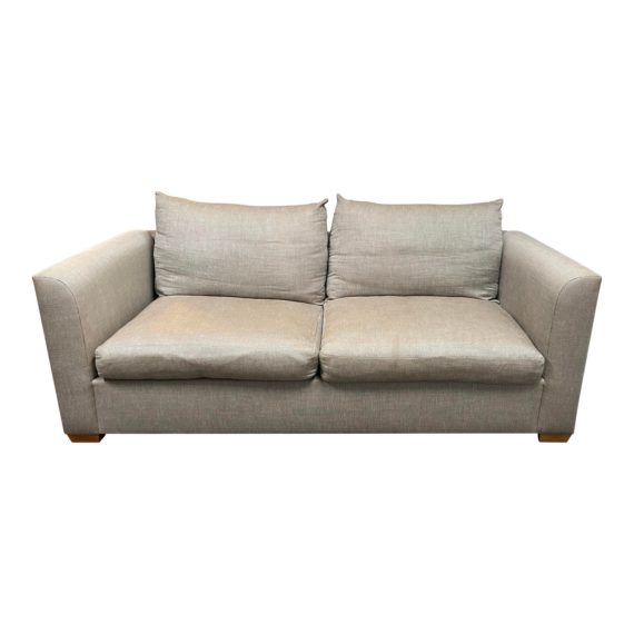 Design Plus Gallery presents a Kreiss Custom Sofa. Back cushions are filled with a 90/10 duck down fill. Seat cushions are down wrapped with a high density foam. Fabric is synthetic wool blend of ivory, taupe + gray. There is visible wear through out sofa is in good condition from usage. Will benefit from a professional cleaning. Designed in Los Angeles.